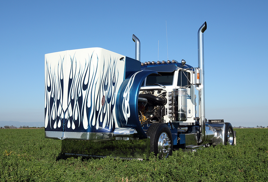 The conventional is the last truck Josh bought for himself before getting off the road. The truck is a 2-axle 2002 Peterbilt 379 long hood with a 550-hp 3406 Cat and a 13-speed transmission. Sitting on a 185-inch wheelbase, the truck features twin stacks and air cleaners, extra lights, a drop visor, upgraded seats and a big stereo. All of the work was done in their own shop, except for the flames and pinstriping, which was done by Harry’s Signs in Hollister, California. After finishing the truck, Josh drove it every day for four years, until he retired from driving.