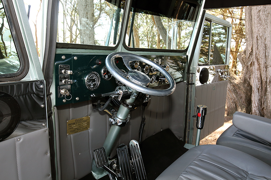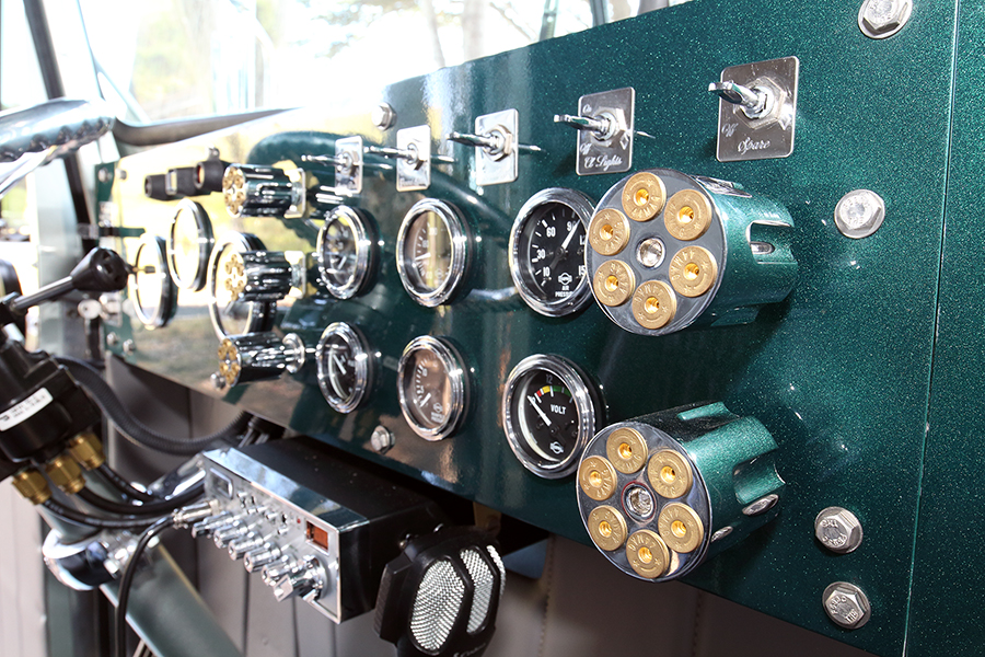 Moving inside the cab, a lot was done in there, too. All of the dash pieces were painted green, new Isspro gauges were installed, a Colorado Custom steering wheel was added, as well as a custom shifter, made by Neil and Danny Norwood, using hollow tubing to hide all of the lines inside. The interior also features Bostrom Low-Ride seats, custom gray door panels with Neil’s ranch brand embroidered on them, along with custom mirrored-stainless window sill trim pieces, an overhead console for the stereo and speakers, and a partially-carpeted and painted aluminum floor. Hendrickson’s Upholstery in Petaluma did much of the interior work, including the vinyl-covered firewall and headliner.