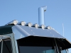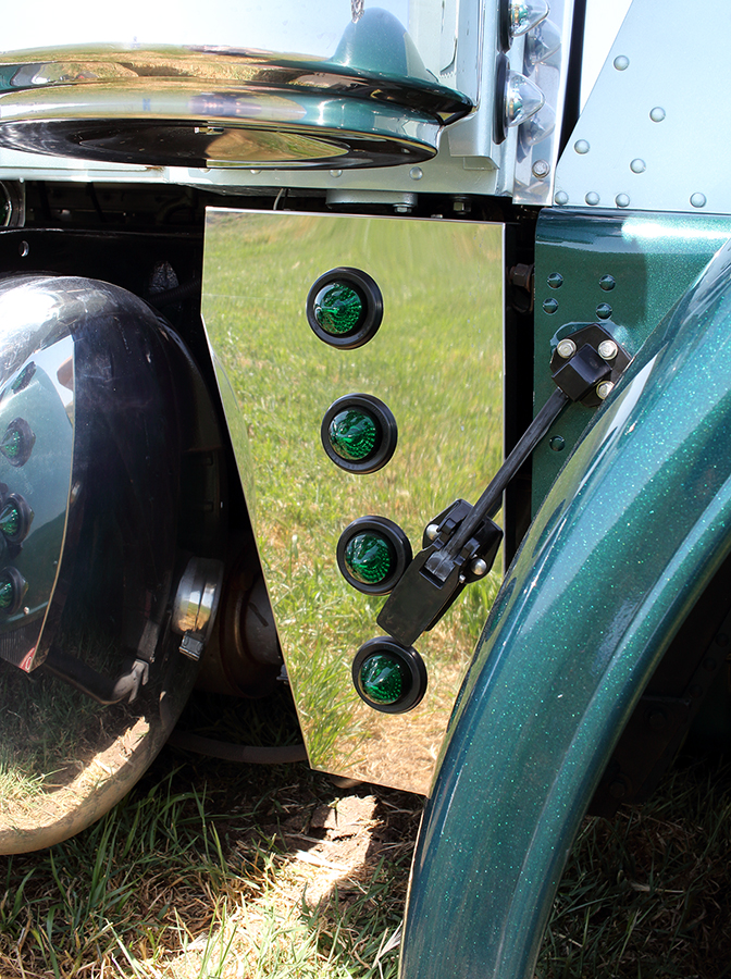Finally, it was time to start adding the bling. Getting many of the accessories from our friends at 4 State Trucks in Joplin, Missouri, Neil installed 8-inch Dynaflex pipes with “Chino” tips and Pickett elbows, a new visor, a 22-inch American Eagle bumper, new air cleaners, new headlights, Hogebuilt stainless quarter fenders and all LED lights. To accommodate the 50-gallon fuel tanks he mounted on each side, Neil moved all of his batteries and air tanks to the inside of his frame rails, and then added stainless tool boxes on both sides underneath the bed, which Neil bought as a kit and then fabricated himself (John at Colorworx painted it). Neil also bought and installed an electric windshield wiper conversion kit, stainless rear light bars, a billet grill, and a custom headache rack, complete with a stainless panel featuring a cutout of Neil’s ranch brand.