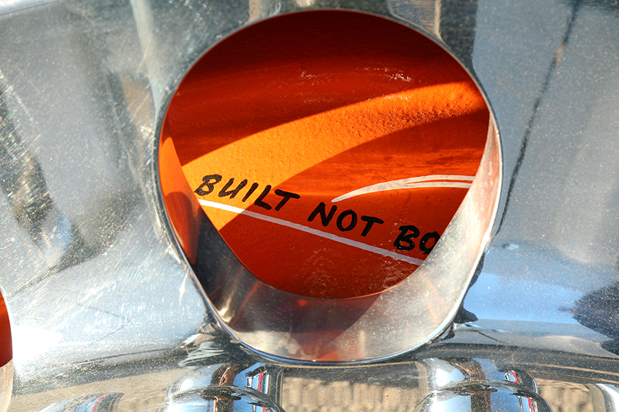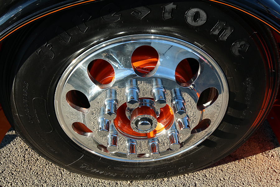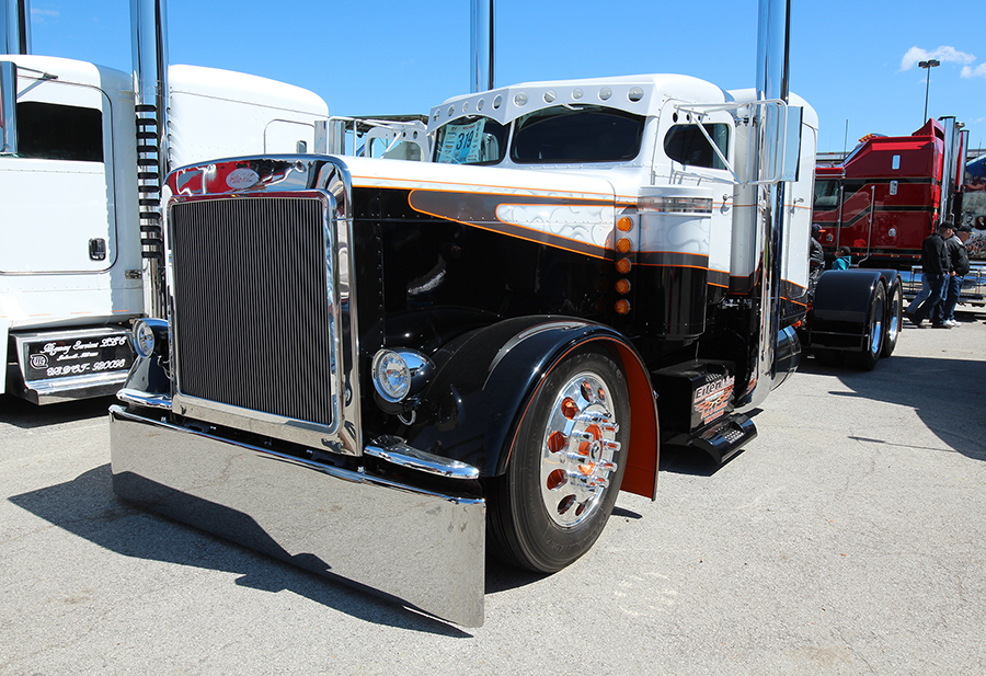 Although he did not win any 1st place awards (except for the Rockwood “Runnin’ Late” award), Jonathan Eilen’s hot rod Pete is worth a mention, for sure.  Starting out as a normal 1990 Peterbilt 379, the Eilen boys chopped the top and did a ton of other custom fabrication to this white, orange and black beast.  Even the brake drums on this truck were painted and pinstriped, and included their now-famous catch-phrase “Built Not Bought” painted on them, which you could see through the holes in the wheels.  It was a very nice touch.