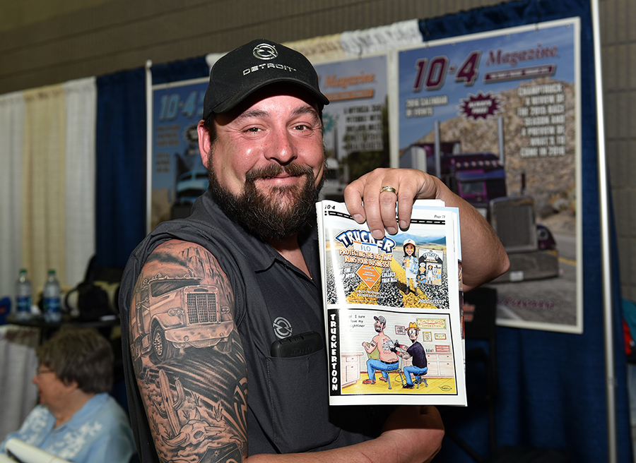 This show, like so many of them, is like a family reunion every year.  We see so many old friends, and make a ton of new ones, too.  This year, we even got to meet a guy who was the inspiration for one of Vic Vasselin’s Truckertoons (see photo).  We would like to thank each and every one who came by the booth to visit and had nice things to say about the magazine.  We would also like to thank Fernando at Stay Loaded Apparel for bringing our two pallets of “stuff” to the show all the way from California.