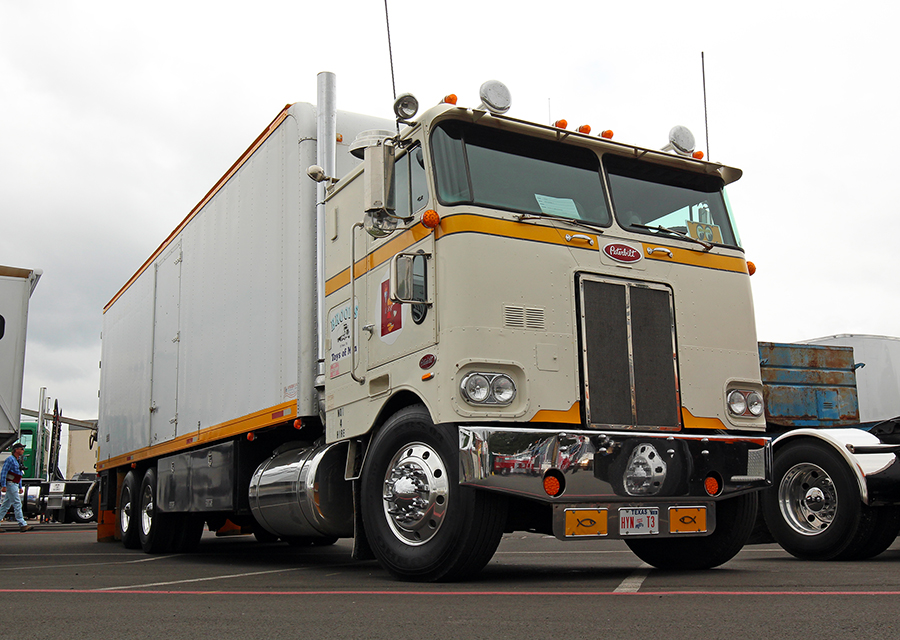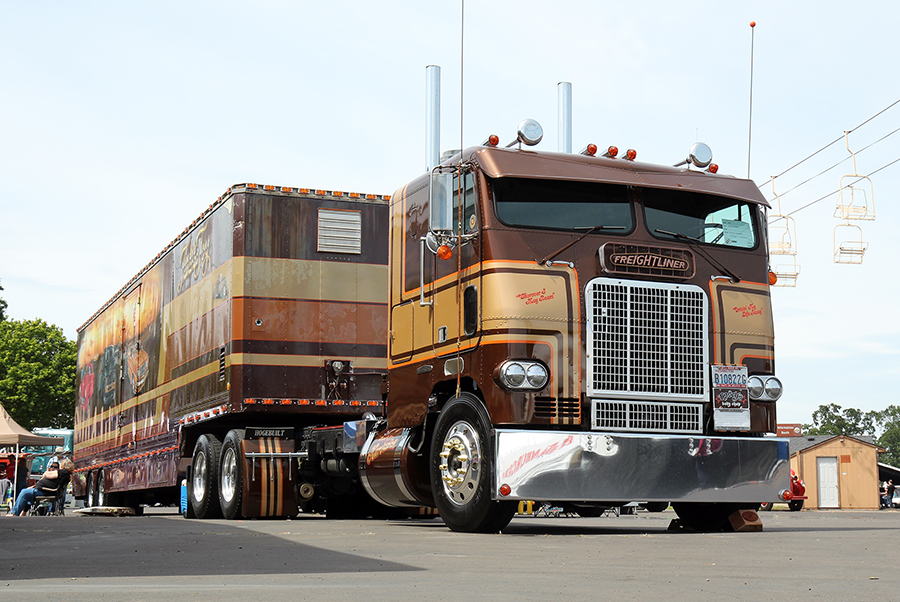 Thursday morning had cool temperatures and cloudy skies. A few times during the day, the wind would pick up and the clouds would even drop a few sprinkles, but nothing too significant. In the area in front of our booth, we had our May 2016 cover truck (Chris Kikelhan’s 1956 KW and Smokey and the Bandit trailer), as well as our resident poet Trevor Hardwick and his amazing brown and gold Freightliner cabover, hooked to a neat old trailer he had just purchased that was once owned by Richard Crane, a famous show-trucker from back in the 1980s. Both of these cool combinations turned a lot heads, for sure, but not as many as the other ride that was also parked in front of our booth.