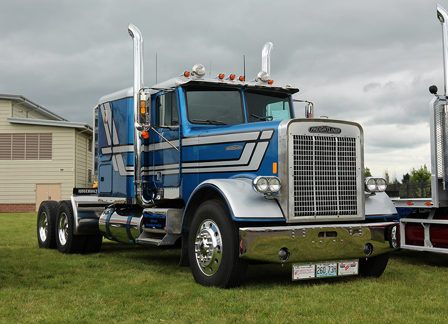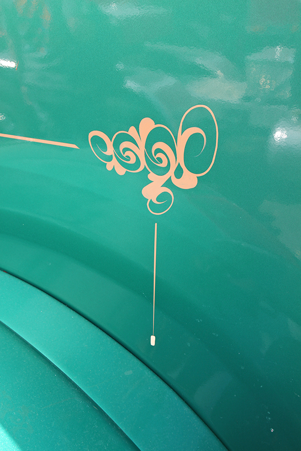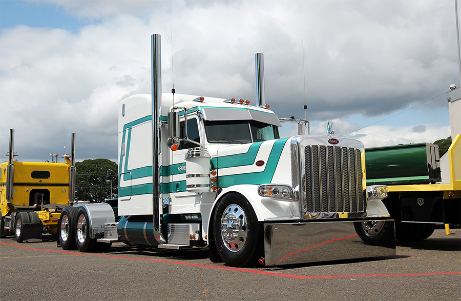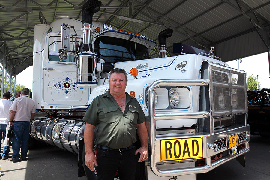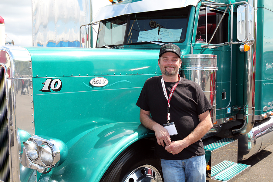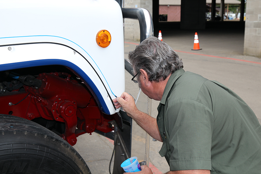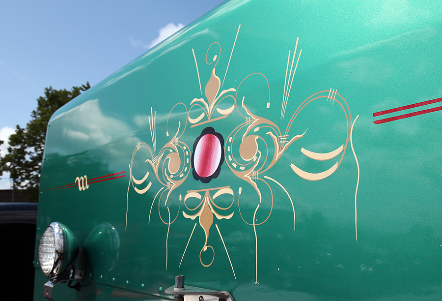 Another popular “attraction” at the show was Gordon McCracken of McCracken Lines & Signs, a pinstriper who was brought in from Australia by one of the show truckers to stripe his white 1989 Mack Valueliner during the show. Gordon’s style is not the usual “old-school” hot rod type of pinstriping that is so popular here in the States, but instead a more ornate and swirly “scroll” type of striping with a filigree flair. And this guy was good. We watched him hand-paint many fine blue lines on that Mack, and he did not miss a beat. And when he shook your hand, boy did he mean it! He also did some of his amazing custom handiwork on Steven Brown’s green 1988 Peterbilt during the show, right there in the parking lot, giving Steven’s already-nice working truck from Kansas a very unique look.