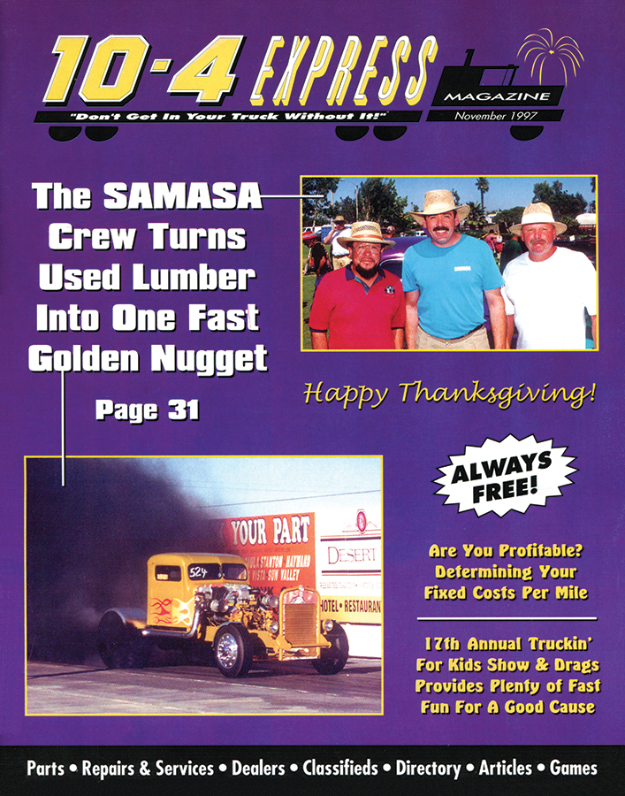 NovWOW1This month brings thankfulness to mind. Many people equate it to Turkey Day. I enjoy Thanksgiving, the coming together, using the family recipes and thinking about Christmas right around the corner, yet during this time of year, I also enjoy reflecting over the blessings in my life. 20 years ago, I received a phone call from an old friend that changed the fabric of my life. It was from Jean, one of the owners of 10-4, and she had a request for me to consider: would I be interested in writing a monthly article for 10-4 Magazine? She gave me free rein over the subject matter, which made this offer even more tempting. So, I decided to venture forth and explore the search engines of the world wide web. The Internet was only four years old and the modem was connected to a phone line. Computers in 1997 did not NovWOW2have the capability or speed to make websites appear in an instant like today, so we had to wait forever to connect to servers. Yes, everything took a long time, but in those days, it did not matter because that was all we knew. It really was an adventure – there was so much to research and learn, and there was a wealth of information now available at my fingertips. Finally, with my research at hand, I began to write about the menu for the very first Thanksgiving shared by the Pilgrims and the Native Americans. That article debuted in the November 1997 edition of 10-4 Magazine. It was fun to research one thought, which would lead to another, and before you knew it, that idea would turn into an article. Little by little, as the months passed, the ideas kept flowing. Did I worry about running out of ideas? Yes, I did, but I was blessed it never came to pass. The joy of researching ideas and writing articles is indescribable. Documentaries and movies are great for gathering ideas – something may be said that will lead to researching a subject, or in older movies the storyline or setting will often get my imagination wondering. Current national or international events are also great sources of ideas, which make us more aware of our world and our surroundings. Add history, literature, nature, science and the weather, and that is just the beginning – the list is endless. But, the most important part of these 20 years, has been the readers who enjoy the articles and the team at 10-4 Magazine for their ongoing support. My wish for all is that the freight keeps moving and you all use and enjoy the magazine. I want to express my gratitude by saying, “Thank you 10-4 for believing in me!” Here’s to 20 more fun years together!!