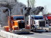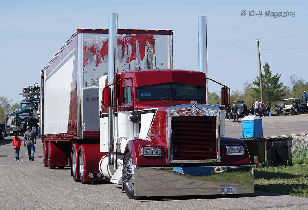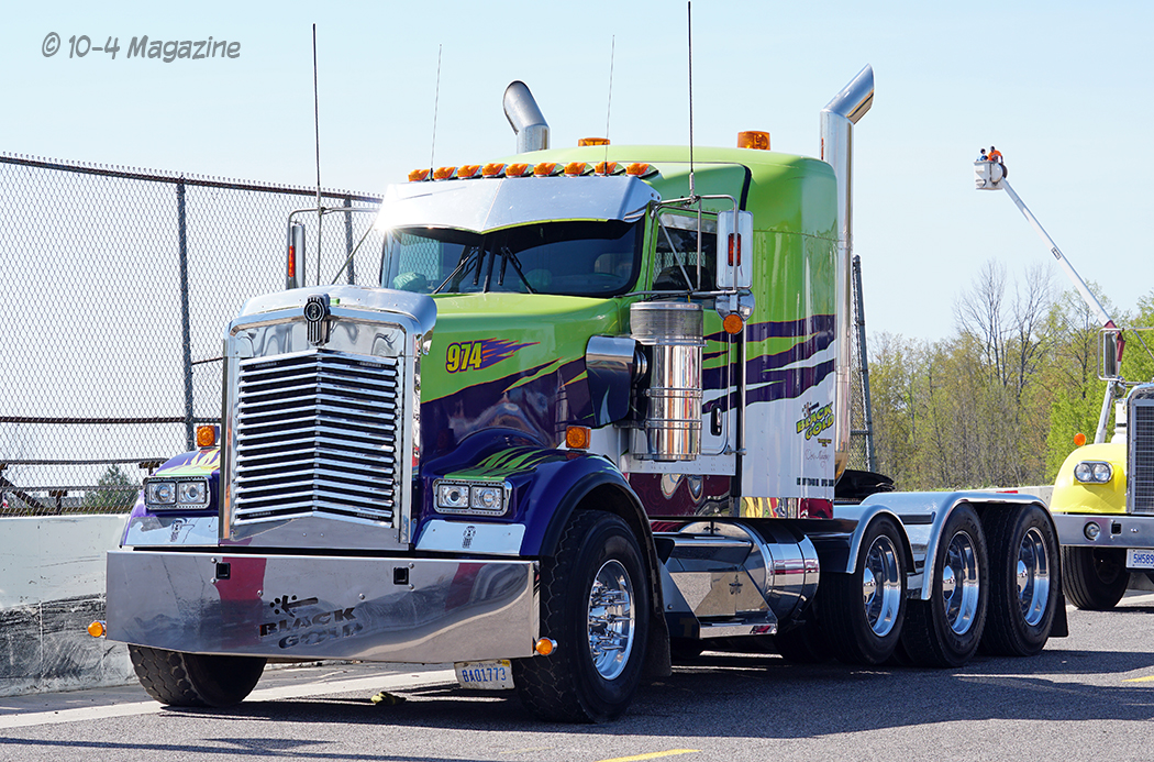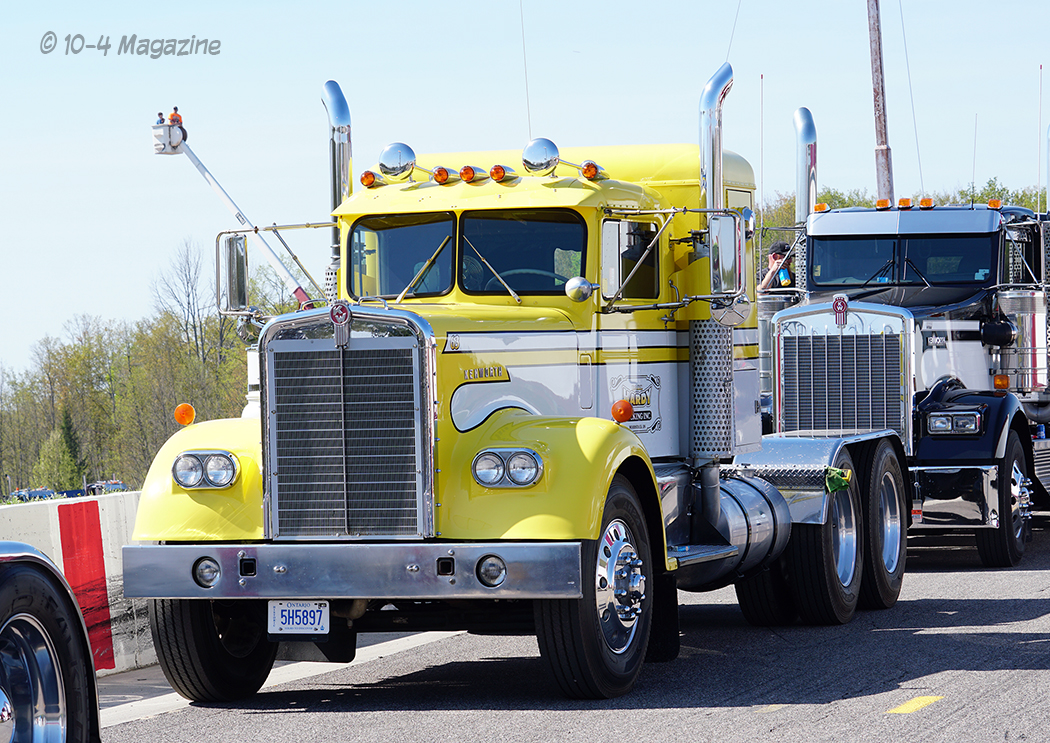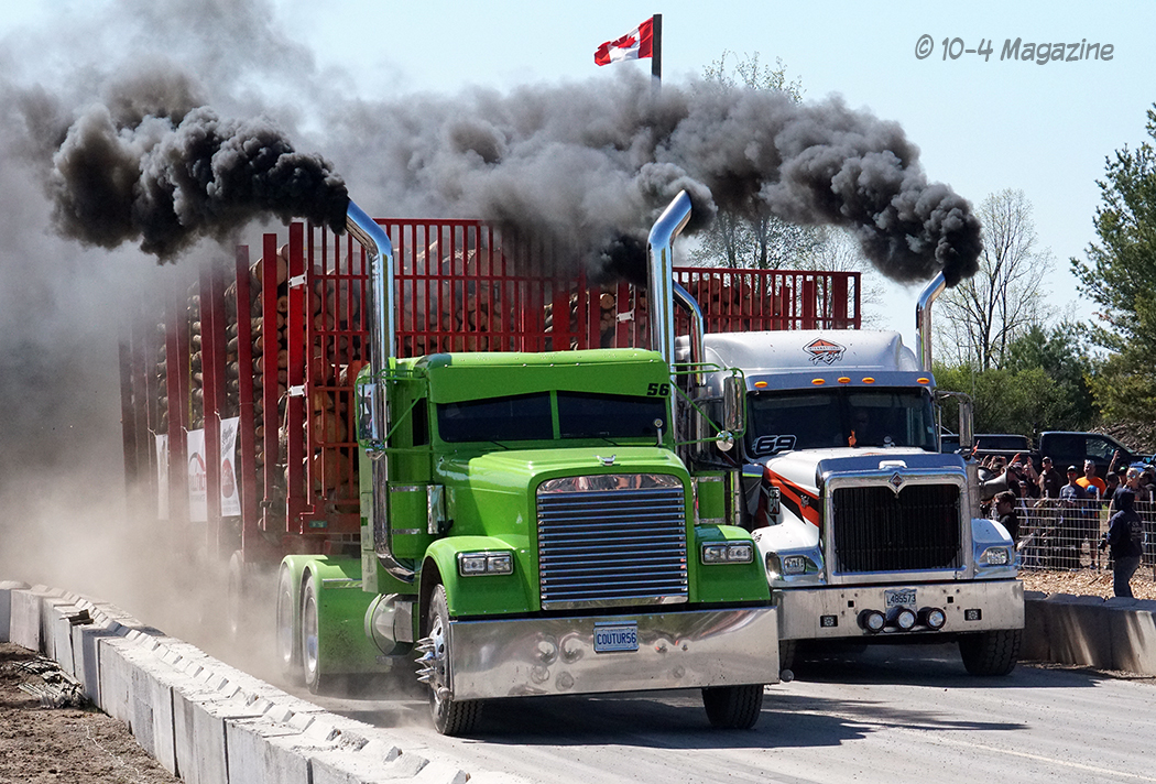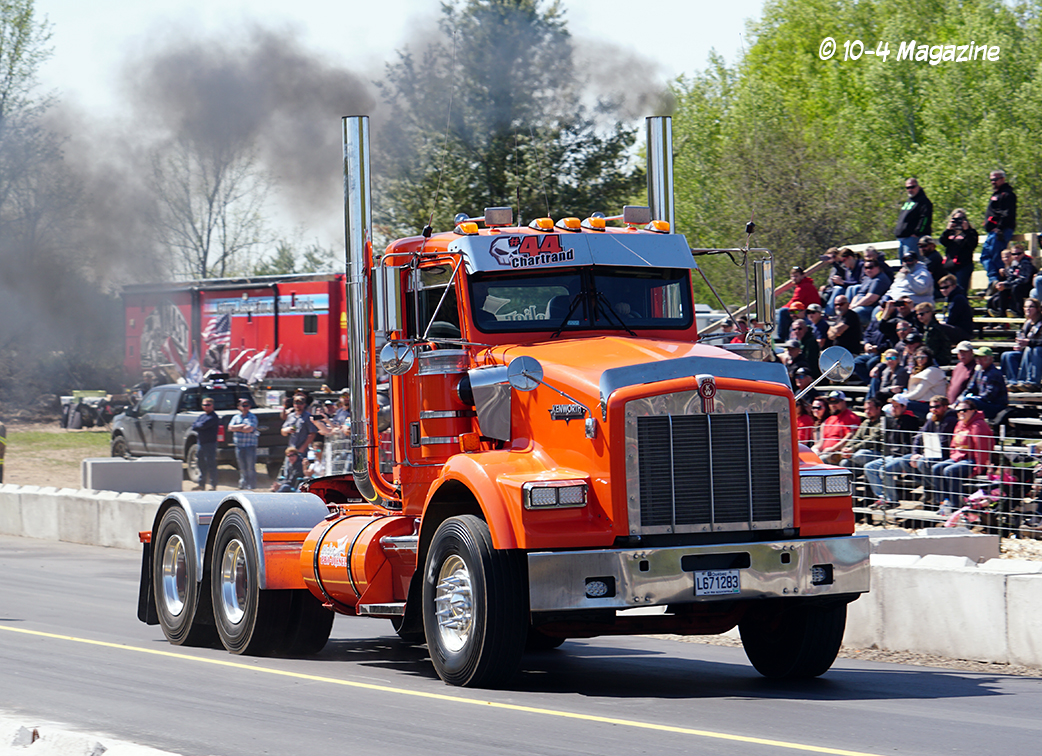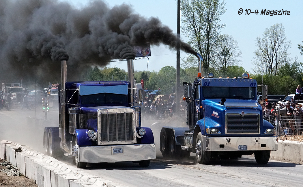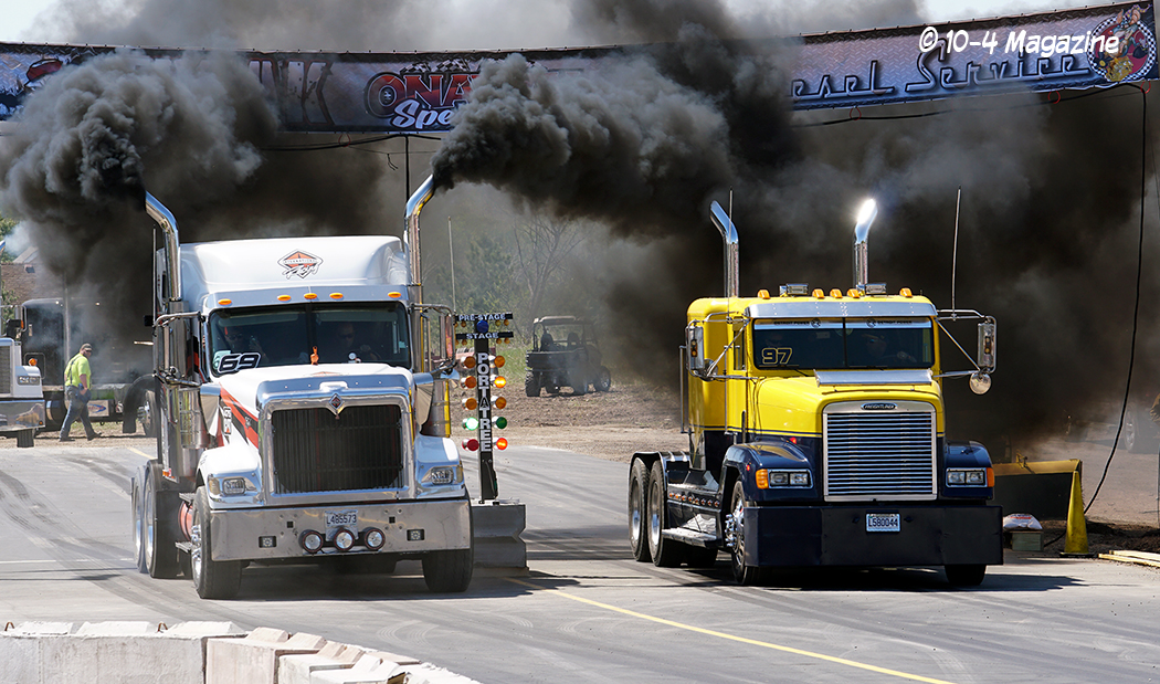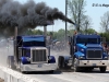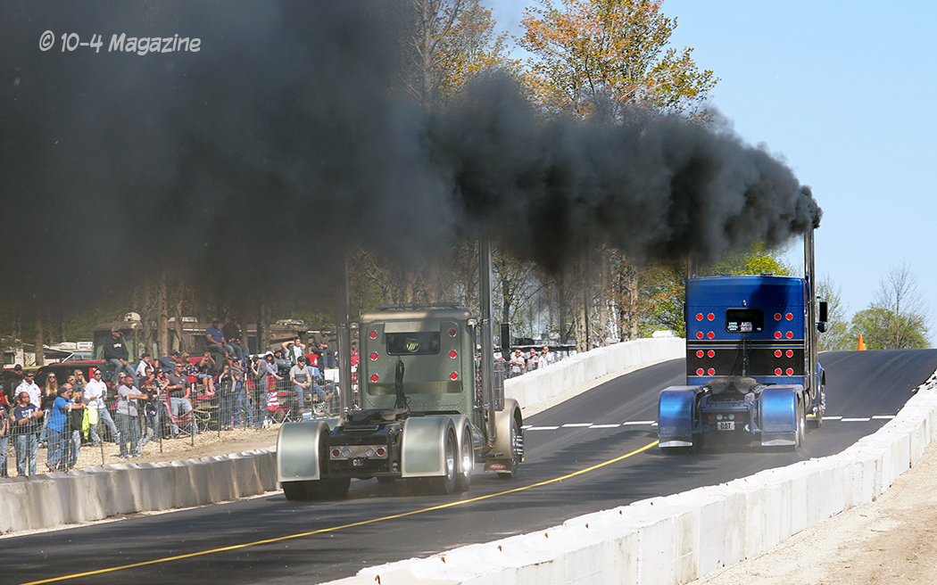 Friday was a beautiful day, and bobtail trucks were allowed to make practice runs from 2:00 pm to 7:00 pm.  Prior to the practice runs, I was able to catch a small convoy heading up to Onaway consisting of Wade LaLone of Diesel Freak and his well-known “Foolish Pleasure” Kenworth W900, along with Curt LaLone, owner of MLT Transport out of Mt. Pleasant, MI with his 2002 Peterbilt 379, Michael Ostetrico of MO Power/MO Haulers and Recovery out of Aurora, OH driving his Kenworth W900 pulling his trailer loaded with his Peterbilt 379 daycab race truck, and Mario Monette (Mario High Performance Diesel) out of Edmonton, Alberta in his Kenworth W900 pulling his enclosed trailer (which was hiding his Peterbilt 379 race truck inside).
