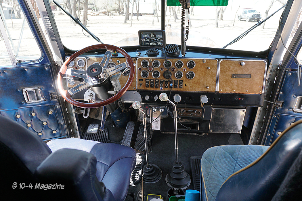 In 1988, Rodney opted to install a long hood, giving Matilda a tough yet sleek look, and making her unique to the other Bicentennials on the road. Today, three paint jobs later, she remains the same colors, but internally has gained some changes, including a 425-hp Cat B-Model under the hood, 3:55 rear gears, Kenworth 8-bag air ride and a conversion from the original 13-speed transmission to a 6×4 twin-stick setup. The blue and white indoor/outdoor carpet has since been removed for a more comfortable interior, and other small modifications were made to suit Rodney’s comfort and needs. Matilda remains age-appropriate, including six-inch stacks and a Kenworth factory bumper. The restoration was done by Dan Potter out of Cunningham, KS. As she has done most of her life, you’ll find Matilda hauling livestock with a 1999 Merritt trailer in Texas, Oklahoma, Kansas and New Mexico, with Rodney behind the wheel.