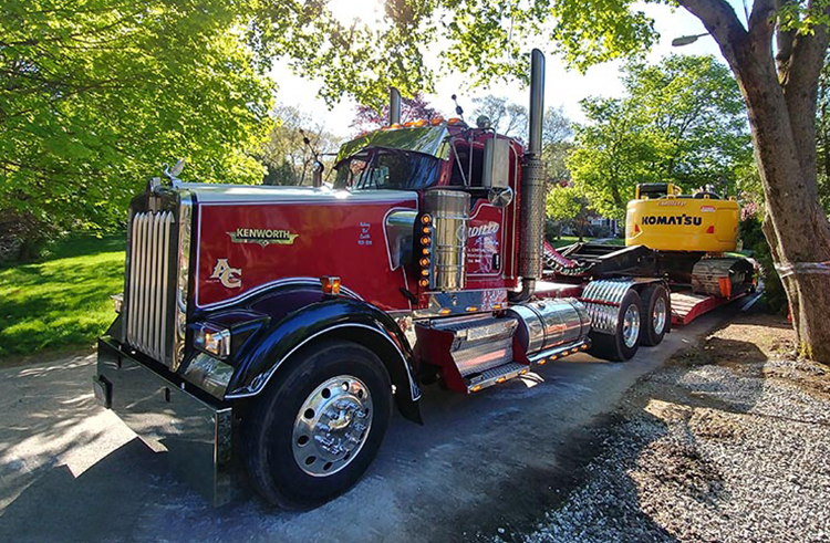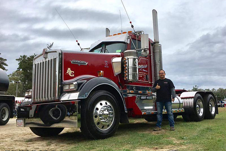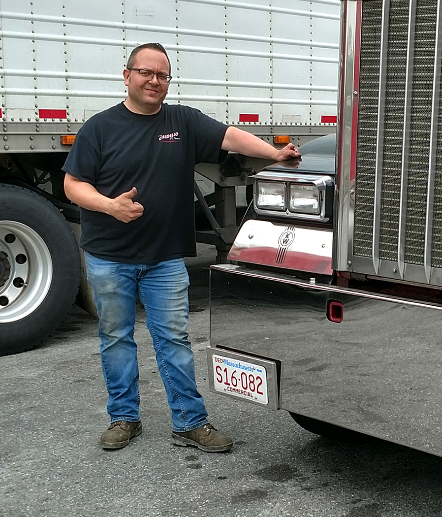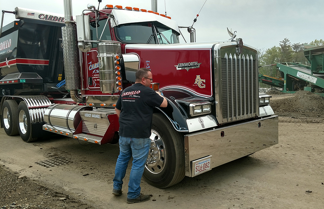 After driving for several different outfits, Mike says he now thinks he’s found the company he will one day retire from – A. Cardillo & Sons out of Waltham, MA. They have been in the excavation and construction business for 70 years. Mike works six days a week, hauling dirt and heavy equipment, and plows snow in the winter. He drives a very good-looking dark red 2007 W900L with a 565 Cummins and an 18-speed, which he cares for like it was his own.
