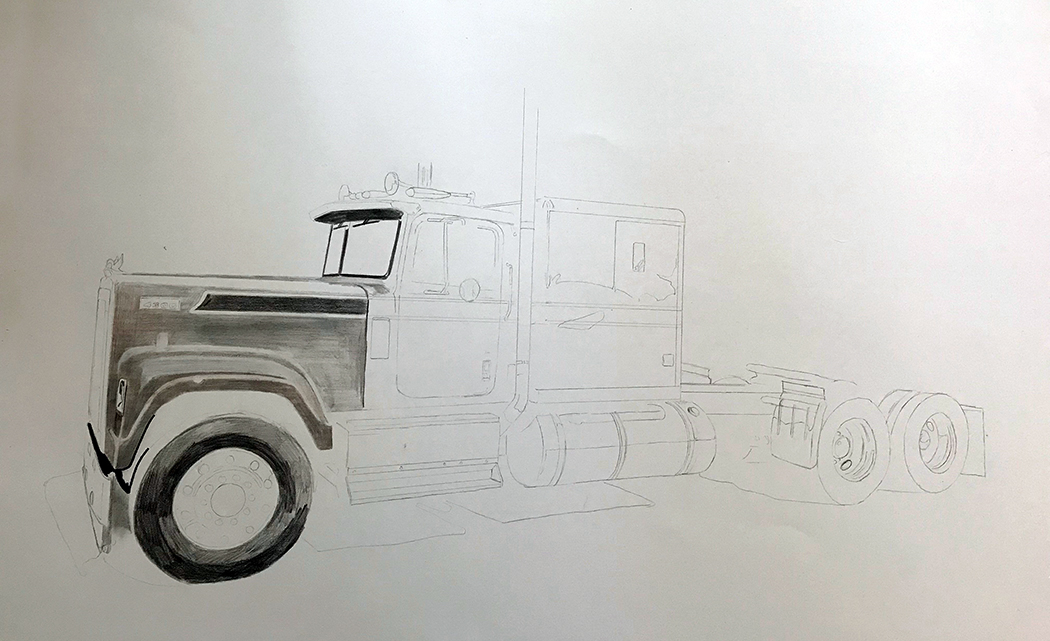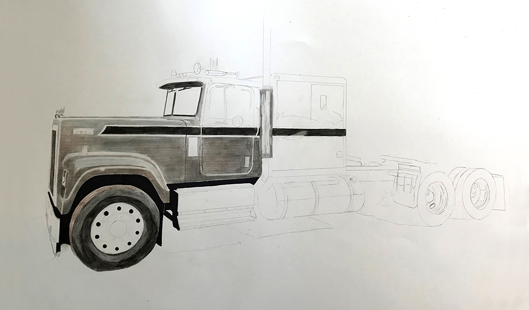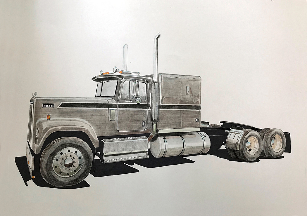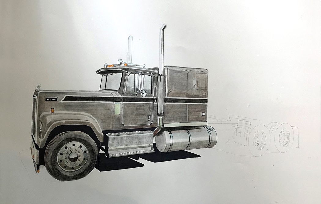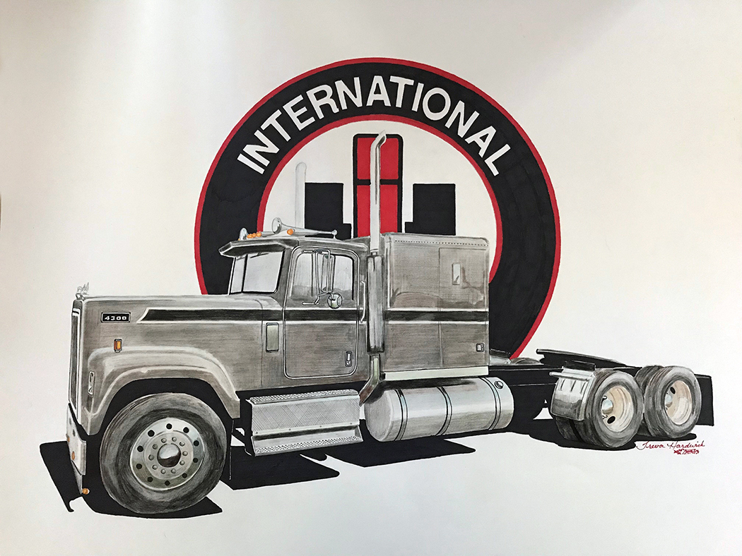 I love talking with Steve about the earlier days in his trucking career. We tend to laugh a lot about the antics of our earlier days, and I really enjoyed drawing this picture of his clean old International. I used lead pencil, colored pencils and Sharpie markers to complete the task, and, honestly, it was refreshing to draw something other than a Peterbilt, a Kenworth or a Freightliner, for once.