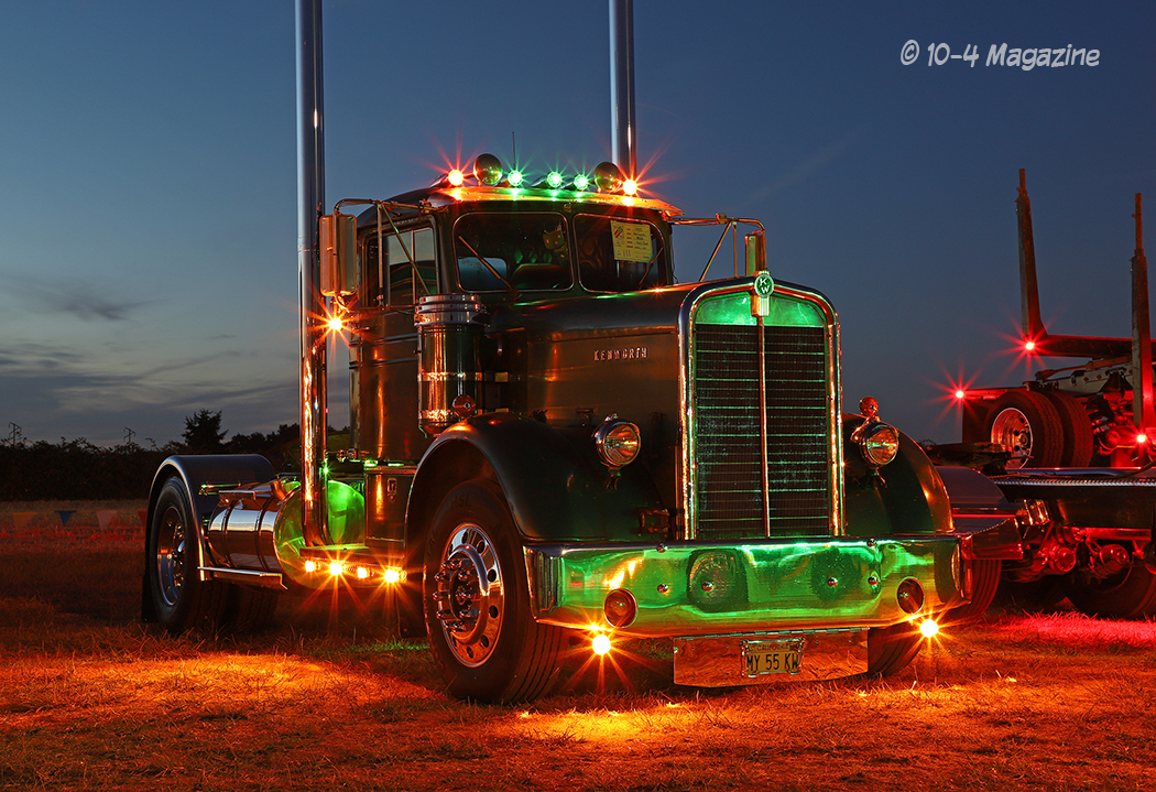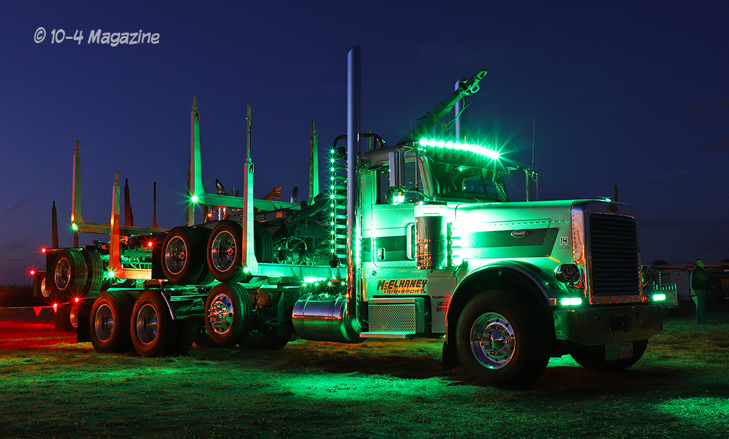 Getting back to the show around dusk, I started taking pictures at the beginning of the first row of working trucks. Three hours later, I was still in the same place! Taking lots of photos of the three or four trucks around me, which were all looking top-notch, many friends and fellow photographers joined me in shooting pics and talking. There was so much talking, in fact, that I never walked away from that spot. Thankfully, the two trucks that won awards for their lights were two of the trucks I shot tons of pictures of! What luck!! Jake Bast and his white 2001 Peterbilt 379 took 1st place, while Dan McElhaney and his silver Pete 388 log truck with green and black stripes (and lots of green lights) earned the 2nd place spot.