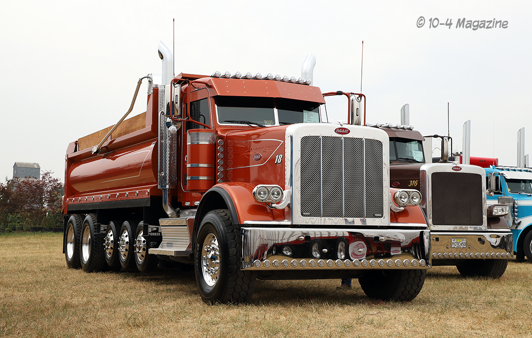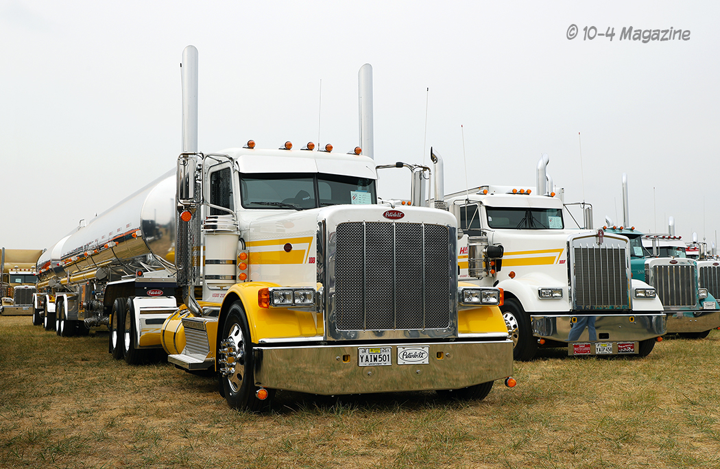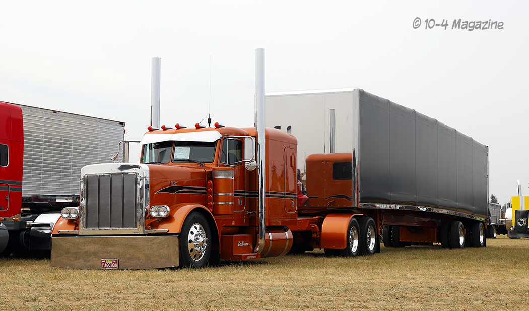 A few that caught my eye included Jake Bast’s white 2001 Peterbilt 379 (the light show winner), Hays Hauling’s pair of white and yellow fuel tankers (one is a Peterbilt and the other is a Kenworth), Austin Johnson’s turquoise 2019 Pete 389 with white stripes and a roll-top trailer, Bill LaBrocca’s 1999 Peterbilt 379 and MAC roll-top trailer (our cover truck this month and the winner of the People’s Choice Best Combo award), Rusty Bradeen’s blue and silver 1996 Peterbilt 379 with a load of beams on his flatbed, and a clean rust-colored 2019 Peterbilt 389 dump truck (I did not get the owner’s name). An owner operator from Sherman Bros. (Team Transport) won the People’s Choice Best Bobtail award with her 2007 Peterbilt 379.