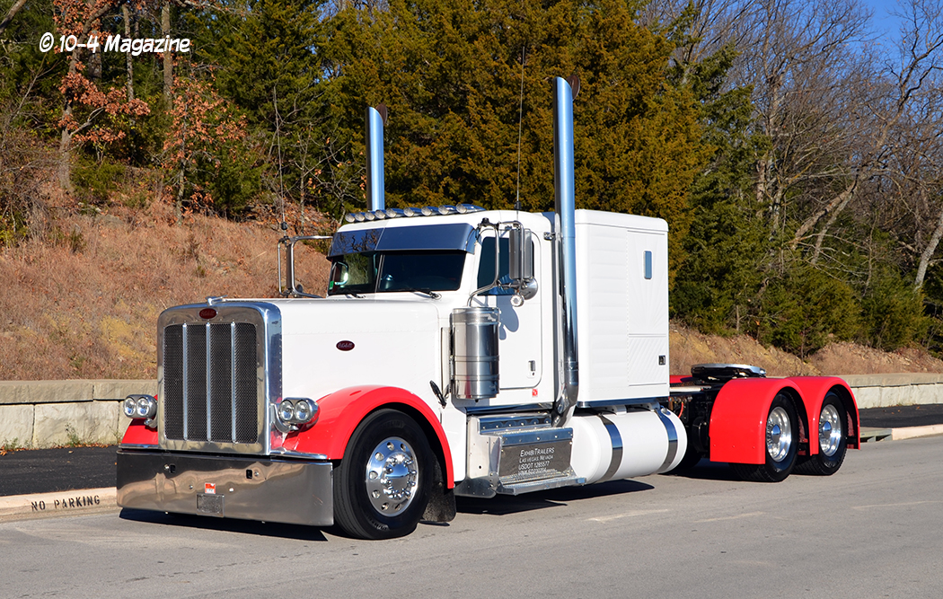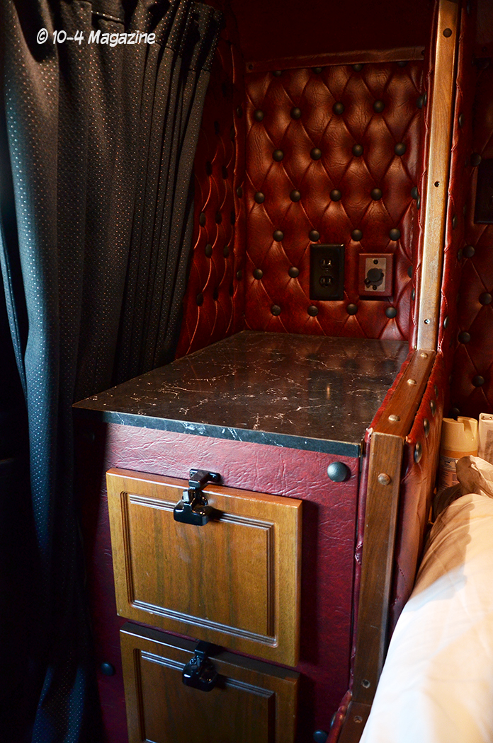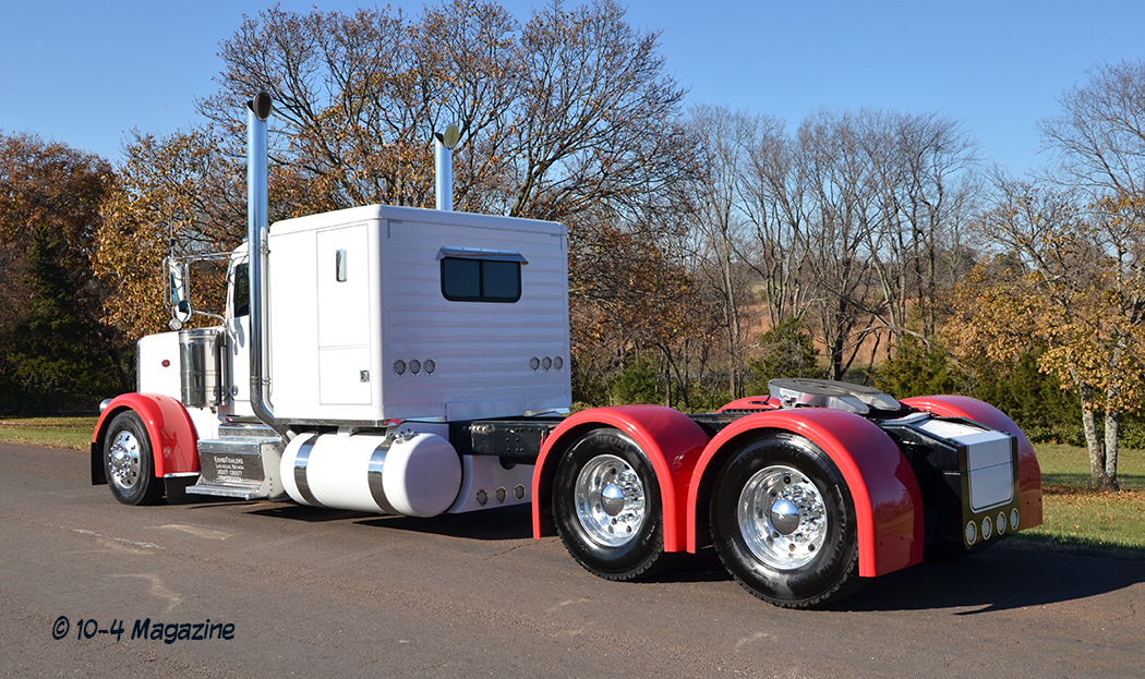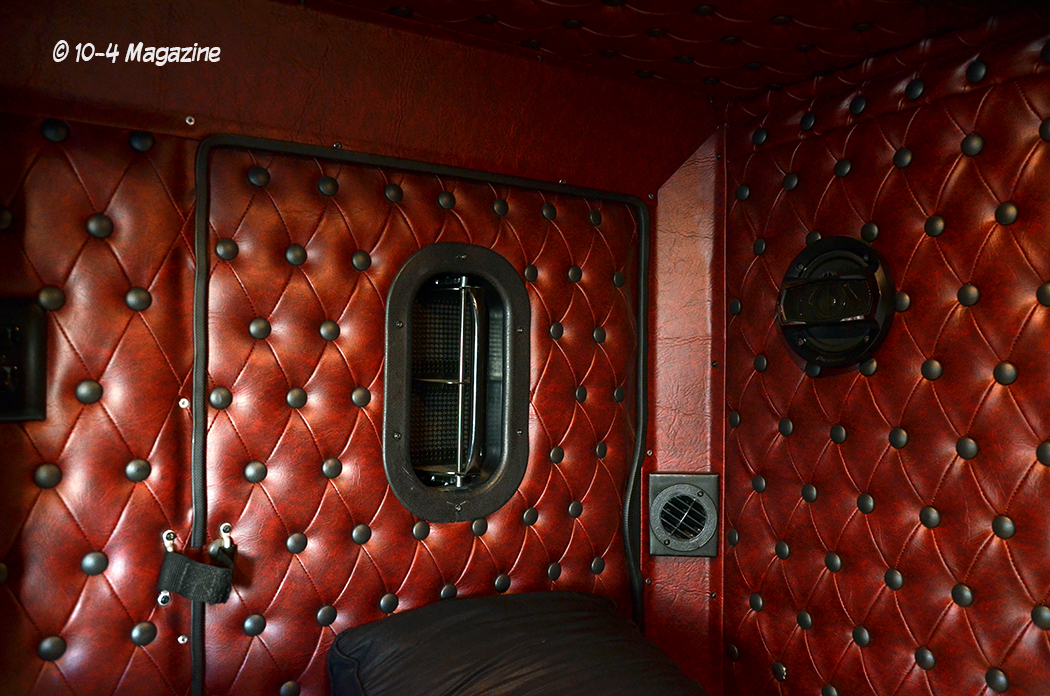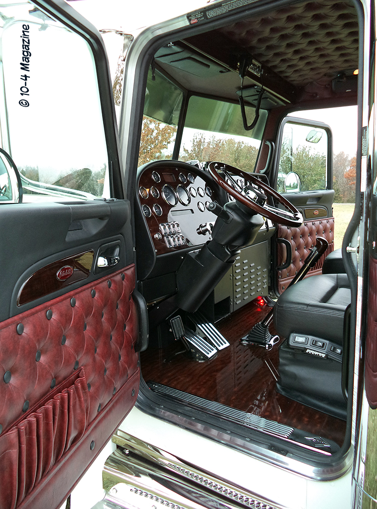 The truck is a 2014 Peterbilt 389 painted Snow white with a black frame and featuring a 600 Cummins ISX, an 18-speed and an air-ride front axle. The sleeper is a 60” Double Eagle that was ten years old but still brand new when we mounted it on the truck. Mike had it re-skinned to resemble a Mercury bunk. The interior of the cab and sleeper were both done in that classic KW button-tuck style, in Crimson red with black buttons, and every square inch of the inside spaces were covered with HushMat before any of the upholstery work was done. The truck has custom wood dash panels to match the custom walnut floor, nine cab lights, 359-style double-round headlights on Double JJ brackets, 7” Dynaflex exhaust and so much more.