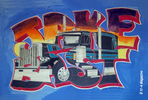 it is getting difficult to find a modern bulb that glows like an incandescent bulb from behind those glass lenses. However, this elusive white Peterbilt had the look I was coveting for my own truck, but I never found the truck parked at the same place where I was parked. That is, until I attended the ATHS truck show in Brooks, Oregon last August (2018). While there, I saw that clean white truck parked in the dusty grass in the field across from me. I walked over and introduced myself to its friendly owner, Jake Bast. Many of you have probably seen Jake’s clean and classy white 379 with a stand-up 63” sleeper online or on social media, or perhaps you’ve seen it in person. Either way, I’m sure you’ll agree that it’s quite a head-turner. So, I was standing there asking Jake about the secret to his ultra-bright lights, and he was gracious enough to reveal which bulbs he uses to achieve that winning look. During our conversation, I mentioned my brown 1981 cabover Freightliner and some of the plans I have for the interior. I mentioned wanting to use old-school glitter style switch extensions, on the dash, but I hadn’t been able to locate any. Jake replied by saying he had some of those at home. I immediately asked if he would sell them to me, and he said, “No, but if you give me your address, I’ll send them to you for free!” I was very excited and appreciative of the gesture, but I honestly figured it would be a forgotten one. Much to my surprise, a few weeks later, I received a box of amber, glitter switch extensions in the mail! Jake, if you’re reading this, I realize it’s been several months and I haven’t seen or spoken to you since then, but I wanted to show my appreciation and let you know I haven’t forgot your kindness. I looked up some pictures online and learned that you now have a beautiful black and blue 359 extended hood! So, I thought I’d do a little artwork and present it here, in 10-4. This painting is done in watercolor and colored pencil, and if you stare at it for a bit, you’ll see it says “JAKE BAST” with the truck confined in the letters. I had fun creating this piece of art, and I plan to bring the original to the ATHS National Convention in Reno at the end of May. Hopefully, I’ll see you there and offer you this token of my appreciation for your generosity.