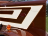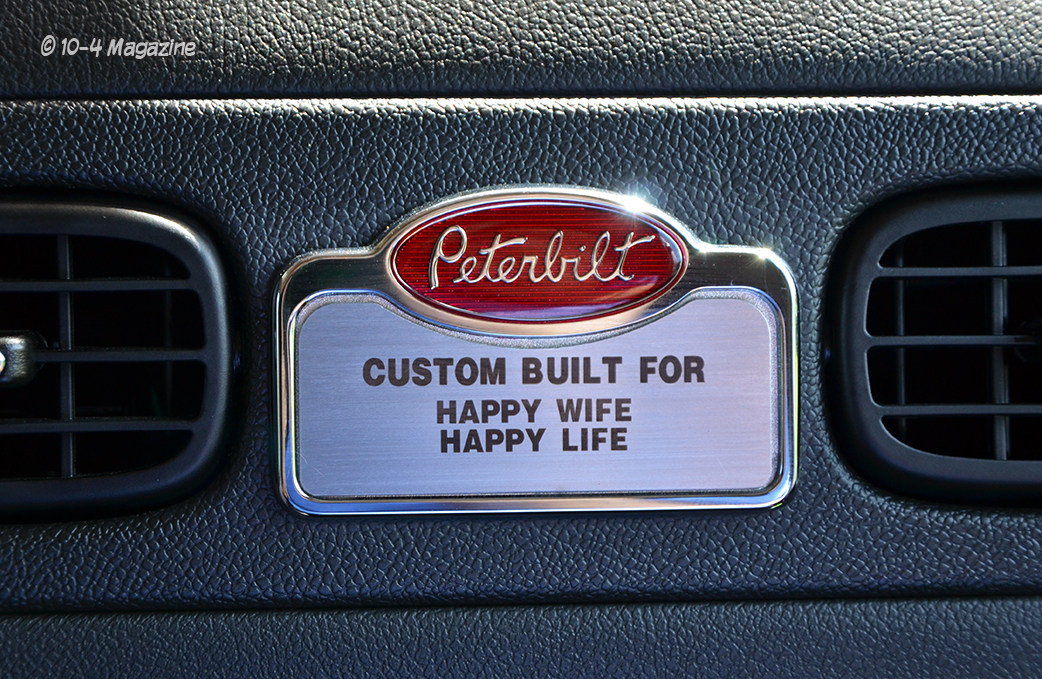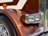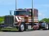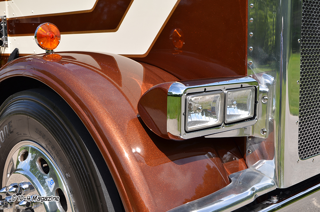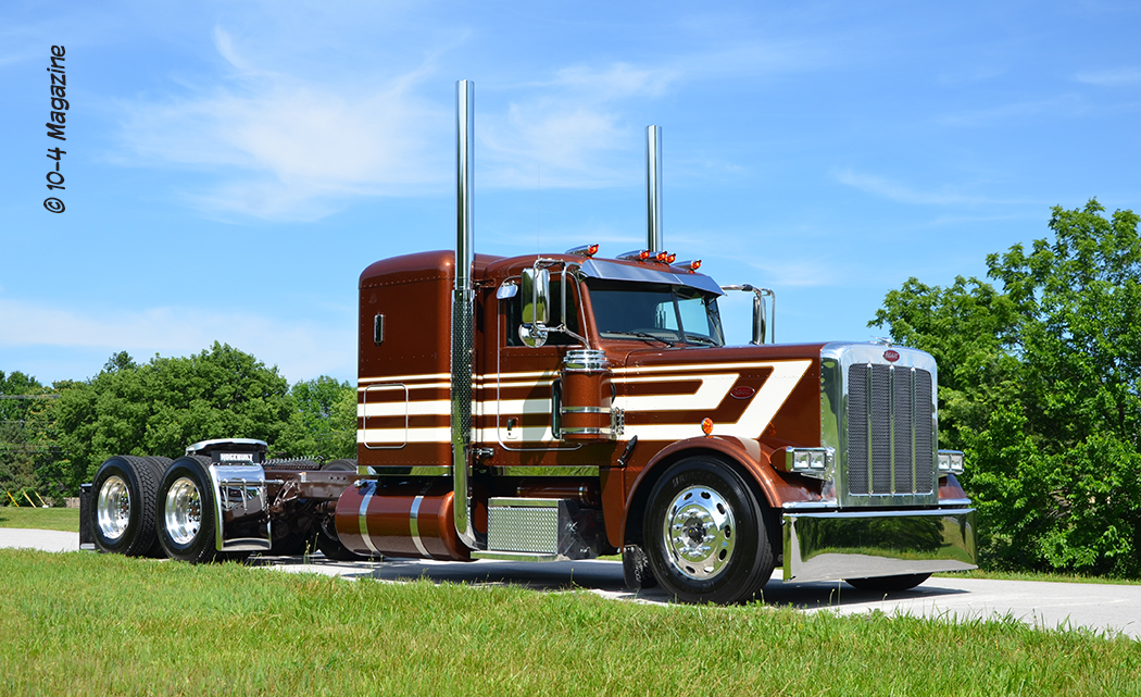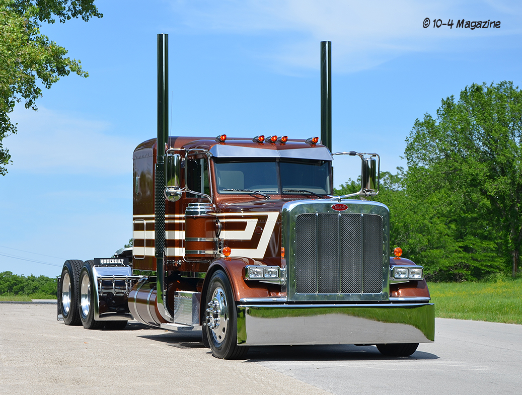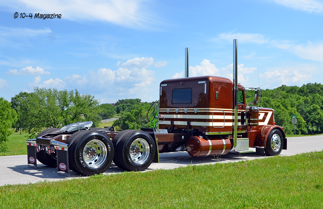 The truck is a 2020 Peterbilt 389 with a 48” flattop, a 280” WB, a 565-hp X15 Cummins hooked to a 13-speed, LowAir suspension on a car-hauler front axle, and Platinum tan interior with all the gauges and switches. After picking out the stripes and colors, Pat went to work laying out the cream stripes with gold outlines, adding glass flake to the gold for some added pop to match that Legendary Brown. Pat also painted the air and fuel tanks, door handle cups and old-school breathers. After that, Jake hid the DEF tank, swapped out the stock headlights for dual squares with painted buckets and added small stainless body skirts. Then, he installed glass cab lights, dump valves, dummy stacks with guards and Hogebuilt quarter fenders.