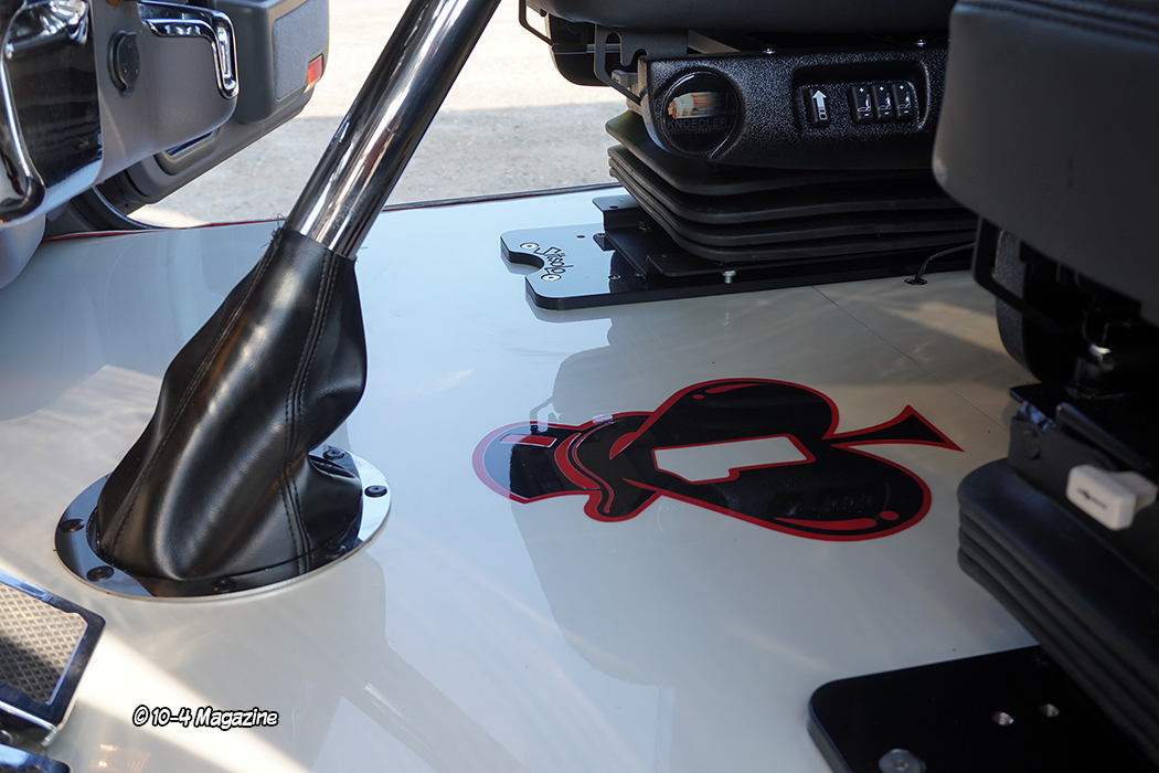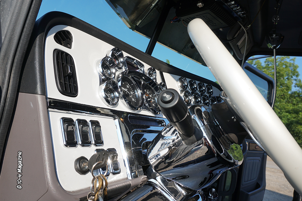 Lemmy sports an American Eagle bumper, 8-inch Dynaflex stacks, full Hogebuilt stainless-steel fenders, an Iowa Customs under glow kit, and a 12 Ga. Customs floor. The Cadillac pearl white dash panels and floor were painted by Bob Jaeger of Jaeger Auto Body in Guttenberg, who is also responsible for Friday Trucking’s decals. Dean installed all of the custom accessories himself, including the Motometer hood ornament and hood grab handles.