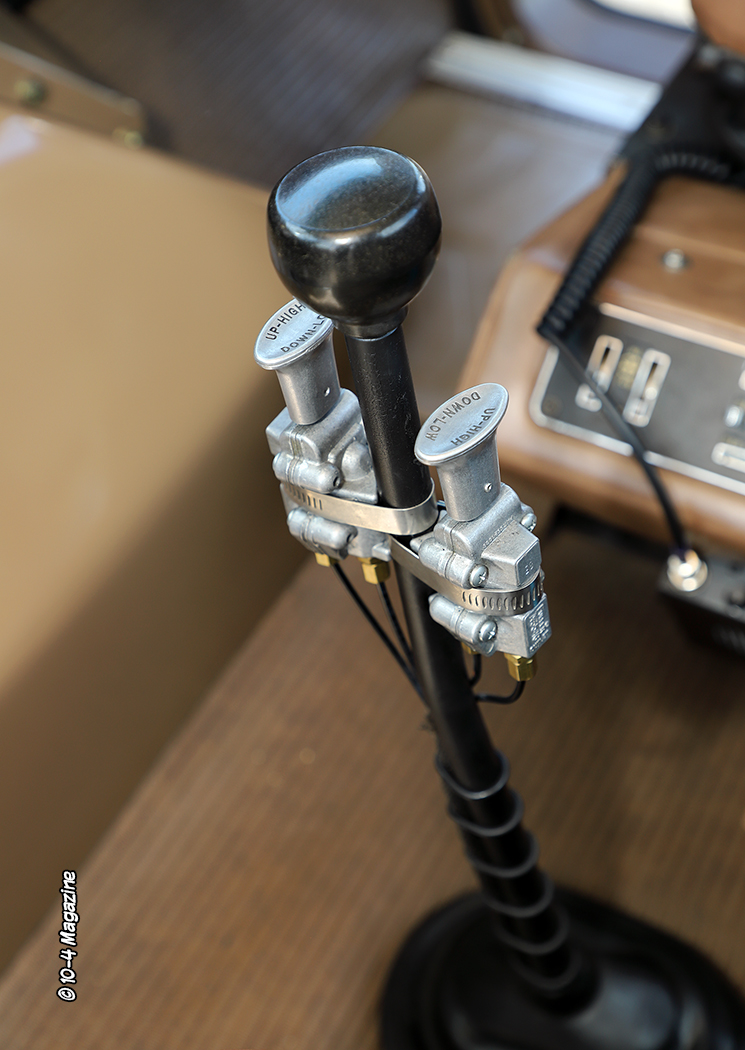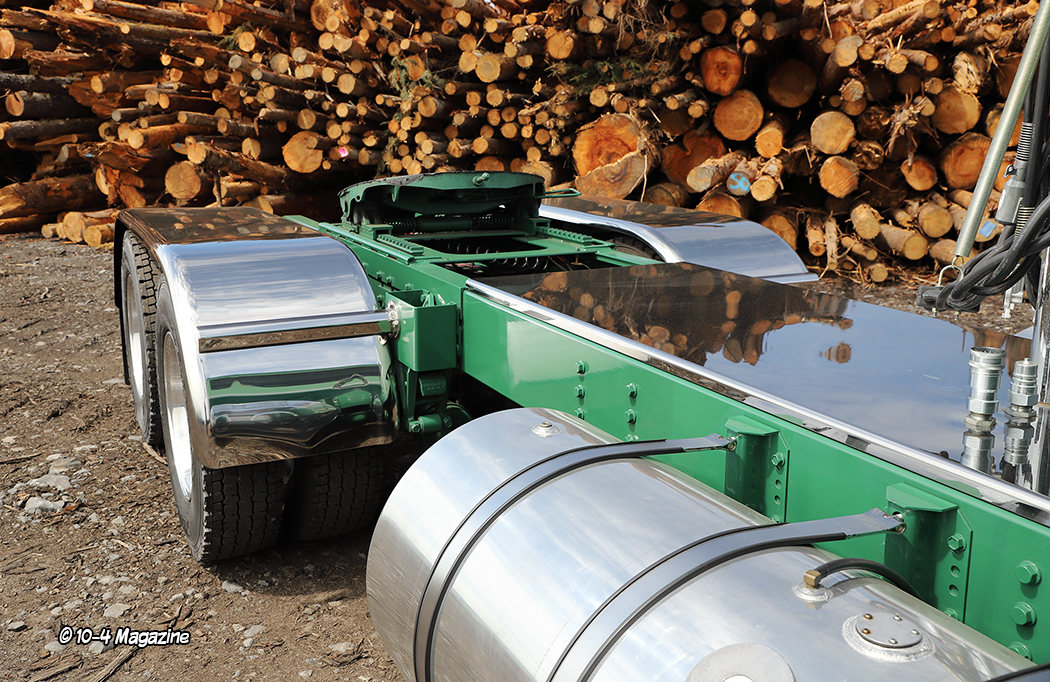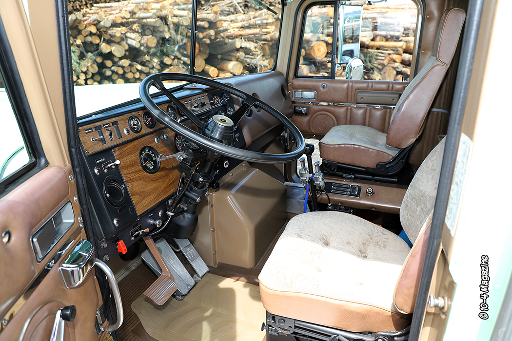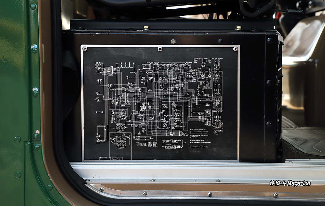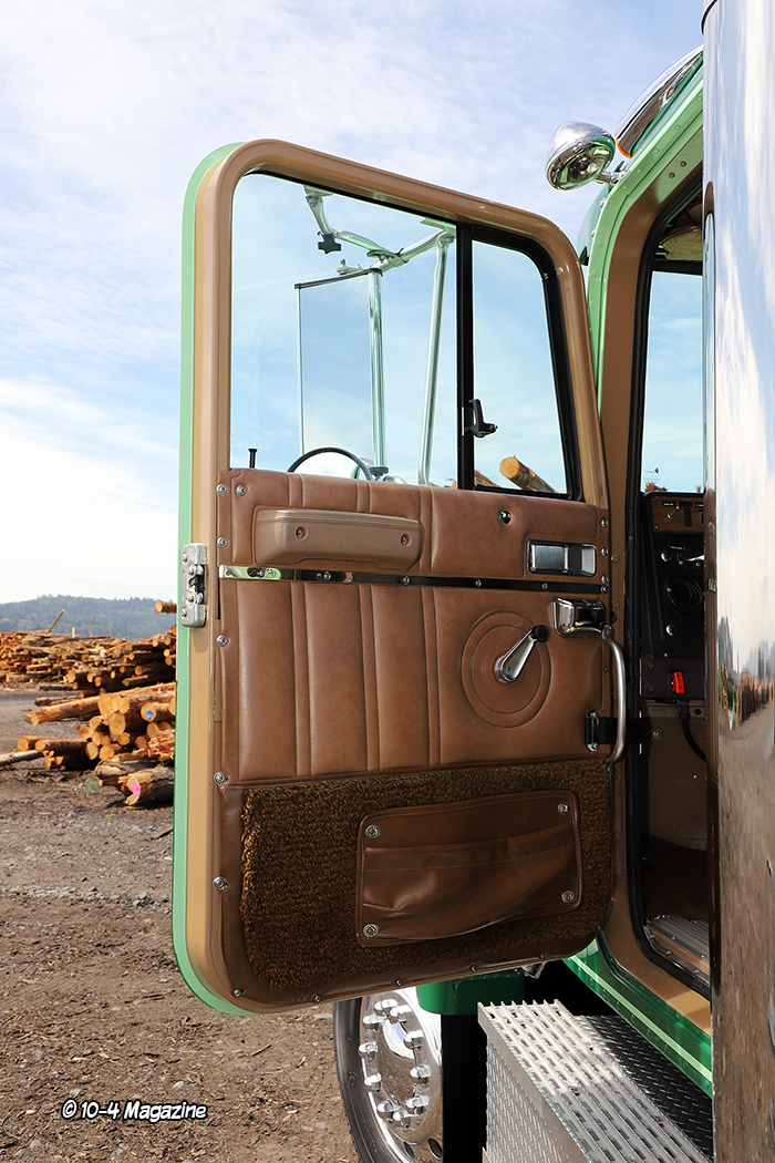 Having a short wheelbase when they got it but wanting to stretch it, Wes Hight, the head mechanic and rebuilder at Lemmons Trucking, found a brand-new set of aluminum frame rails they had that had never been drilled. Starting with these new rails, they completely rebuilt the 4300, which now has a 250” wheelbase, and then put air-ride under it, too. The KTA engine is hooked to a 15-speed transmission and 3.70 ratio rears, and some of the other additions include 7” pipes, a stainless deck plate, stainless half fenders on custom brackets, and, of course, that signature two-tone green paint scheme. The light brown interior of this rig was basically kept stock, which included a complete wiring diagram for the truck riveted to the outside edge of the passenger seat base.