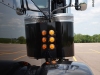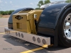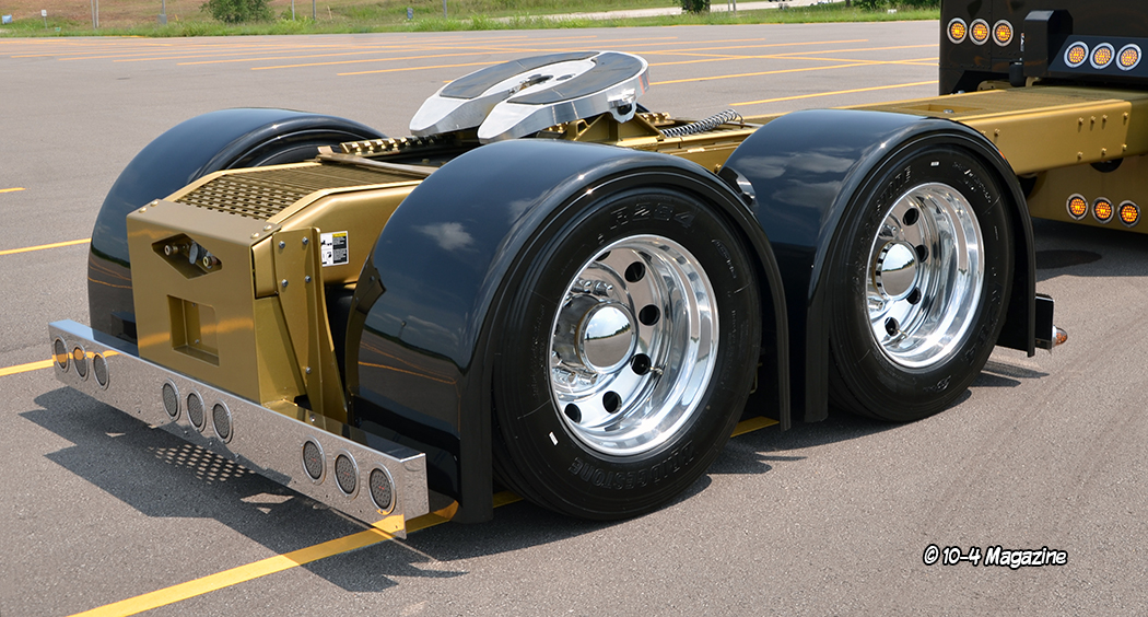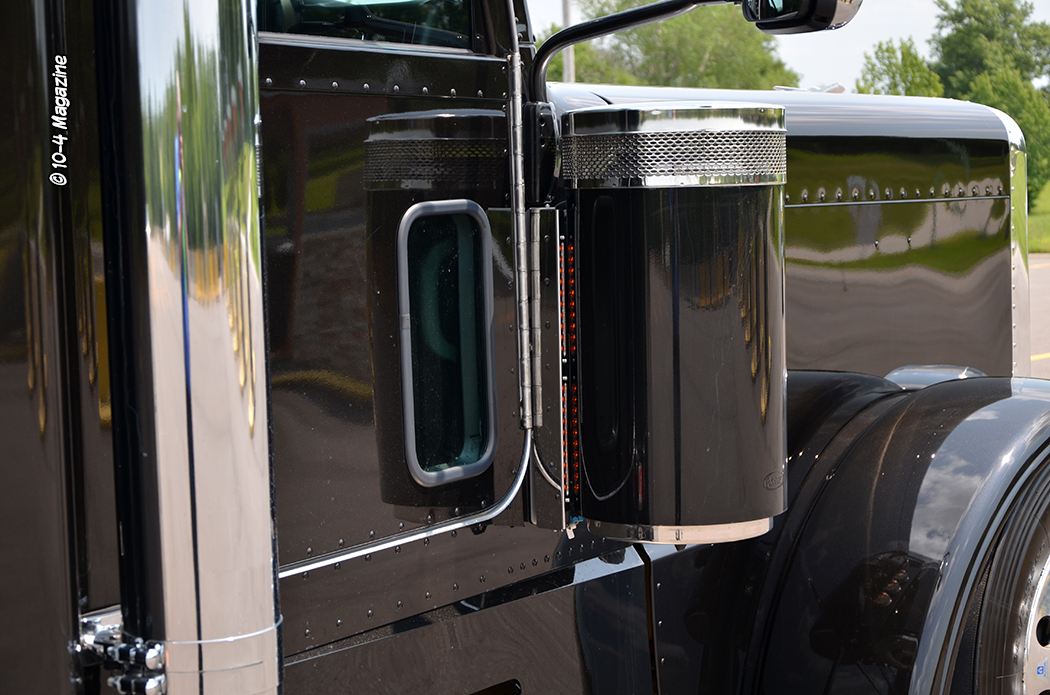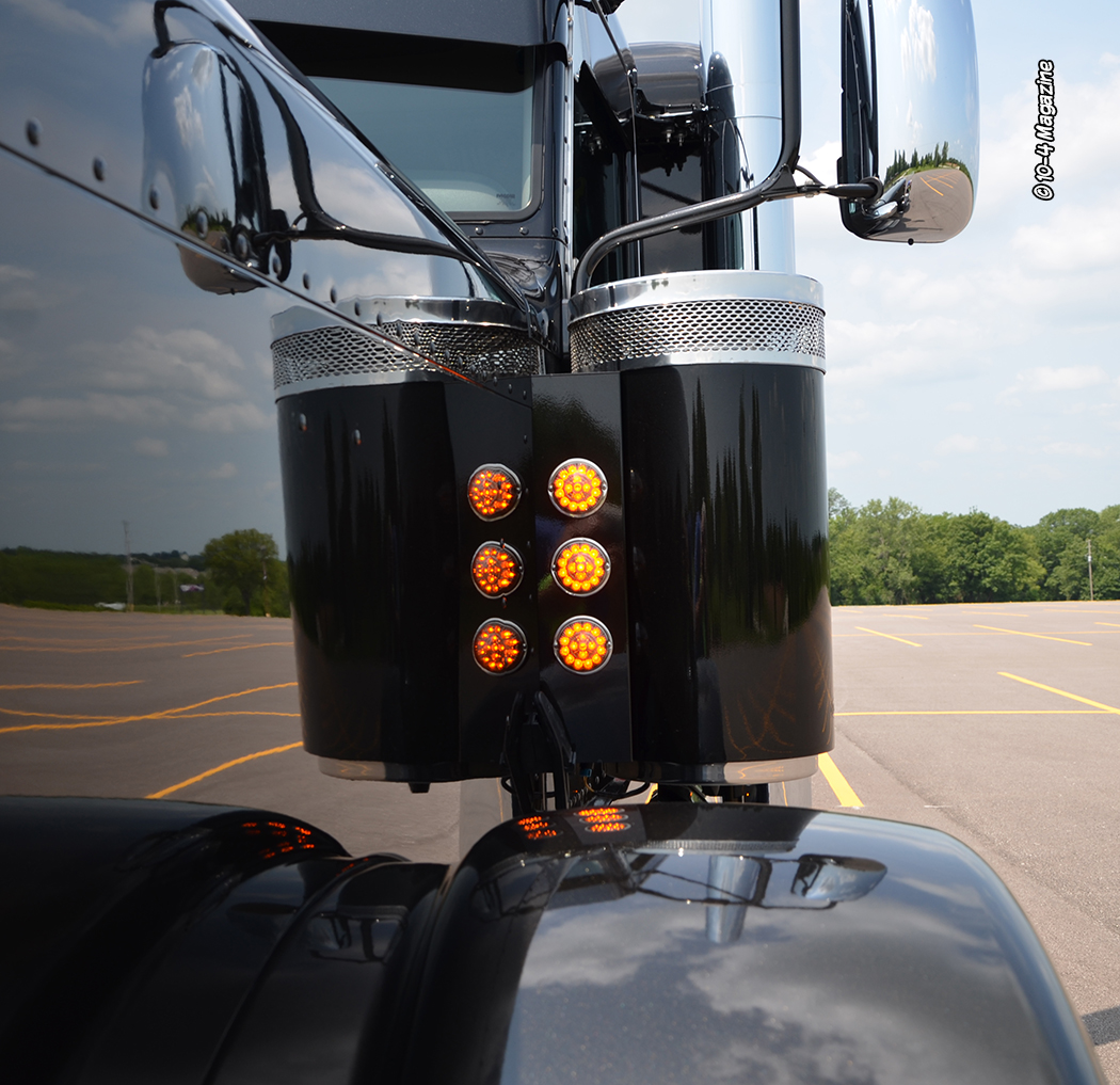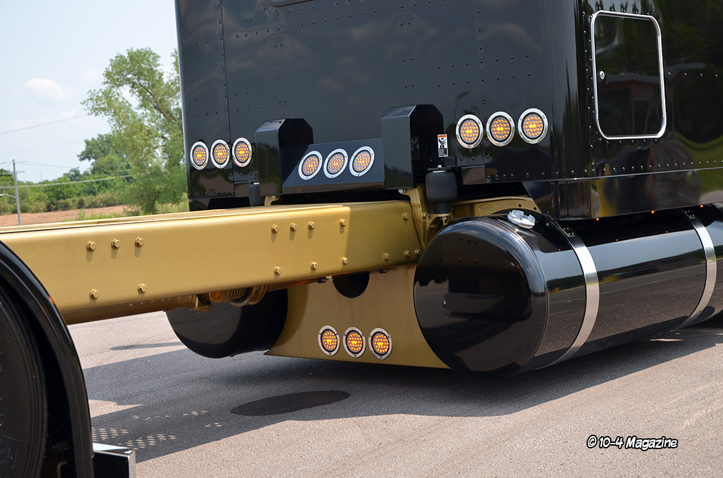 After hiding the DEF tank, the truck was fitted with a Mike Horst air-ride front end, double round LED headlights, strapless breathers with custom breather panels, nine button cab lights, a Bub Bad bowtie visor (painted), Shift rear fenders, 8” full function exhaust, and small tool and battery boxes.  We also added painted window chops, painted cab and sleeper skirts, and then painted the grill screen, mirror brackets, fuel tanks and air tanks.  A painted and flush Merritt deck plate with a V-box was installed, along with a Shox box, an I-panel between the tanks, and custom light bars, front and rear of the drive axles.  Inside, we moved the seats back and lowered them.