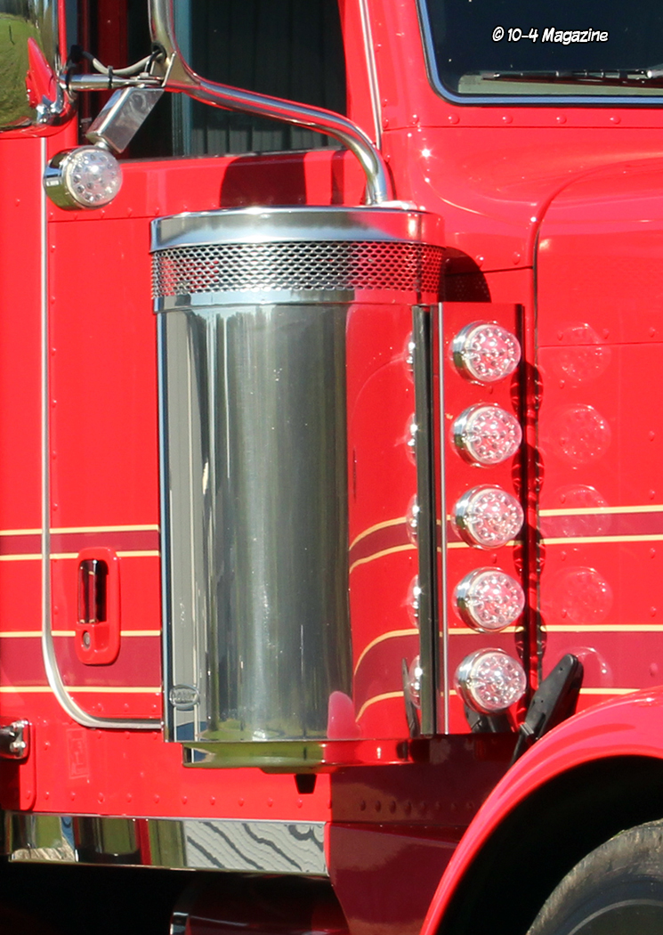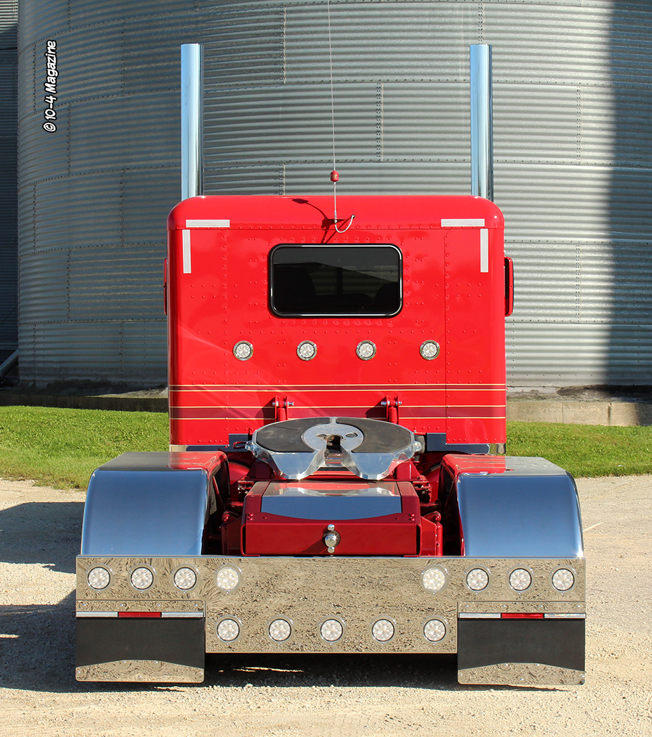 Ordering the truck without the stock factory lights and air horns on the roof of the cab, Mason installed seven watermelon lights on the roof, five lights in the front and back of the breathers, and twenty penny lights on the back of the three-inch drop panels, to illuminate the cab and sleeper.  All the lights on the cab and sleeper are from United Pacific.  To finish the exterior, the factory bumper was replaced with a 20” bumper that tapers to 18 inches and has rolled corners to match the Pete fenders.  These updates and upgrades fulfilled Mason’s dream of what he wanted his Pete to look like.