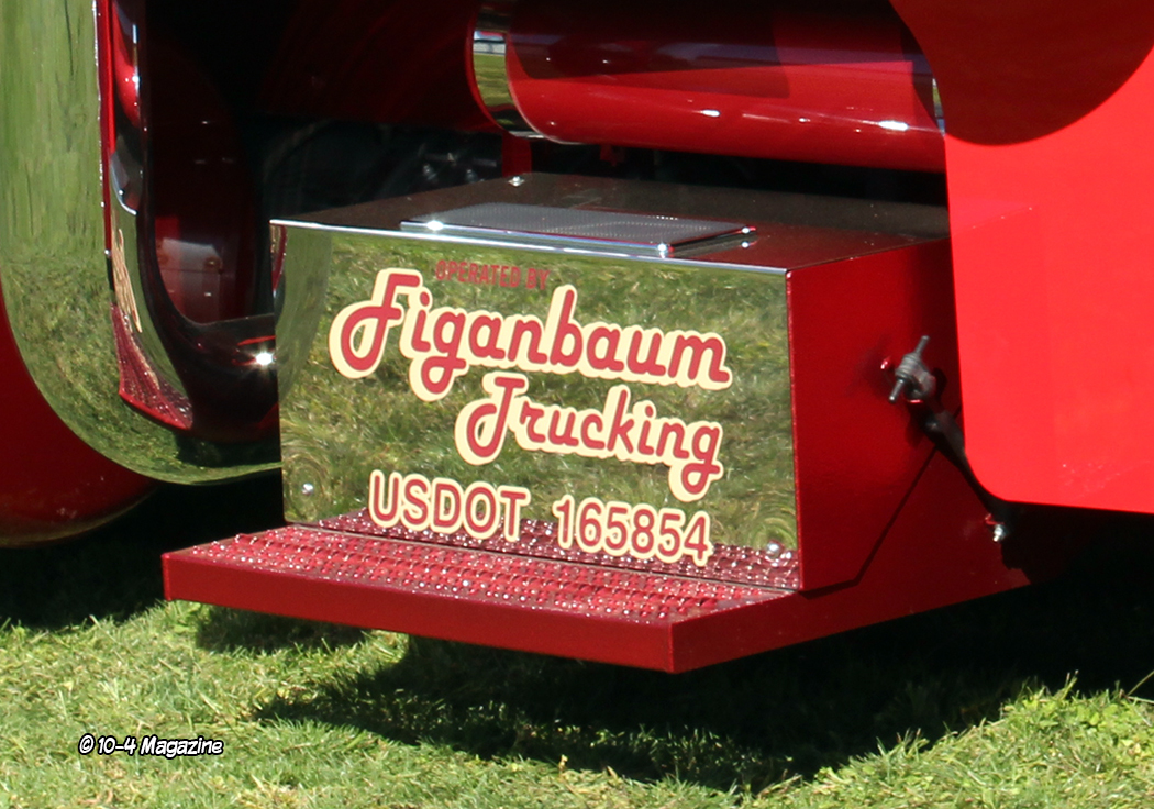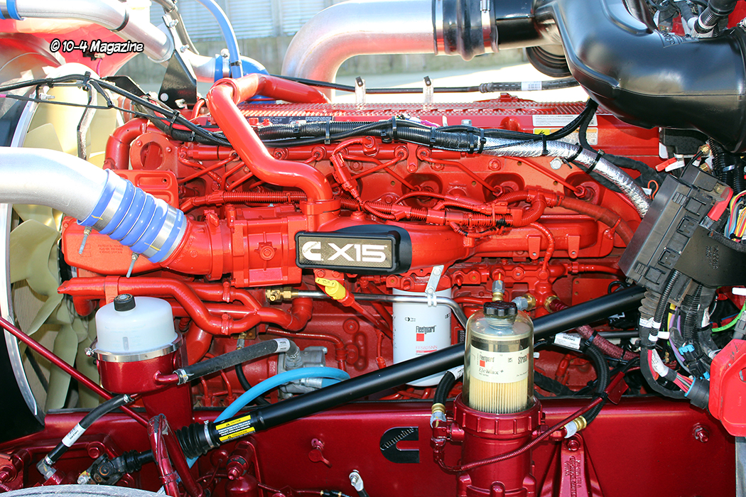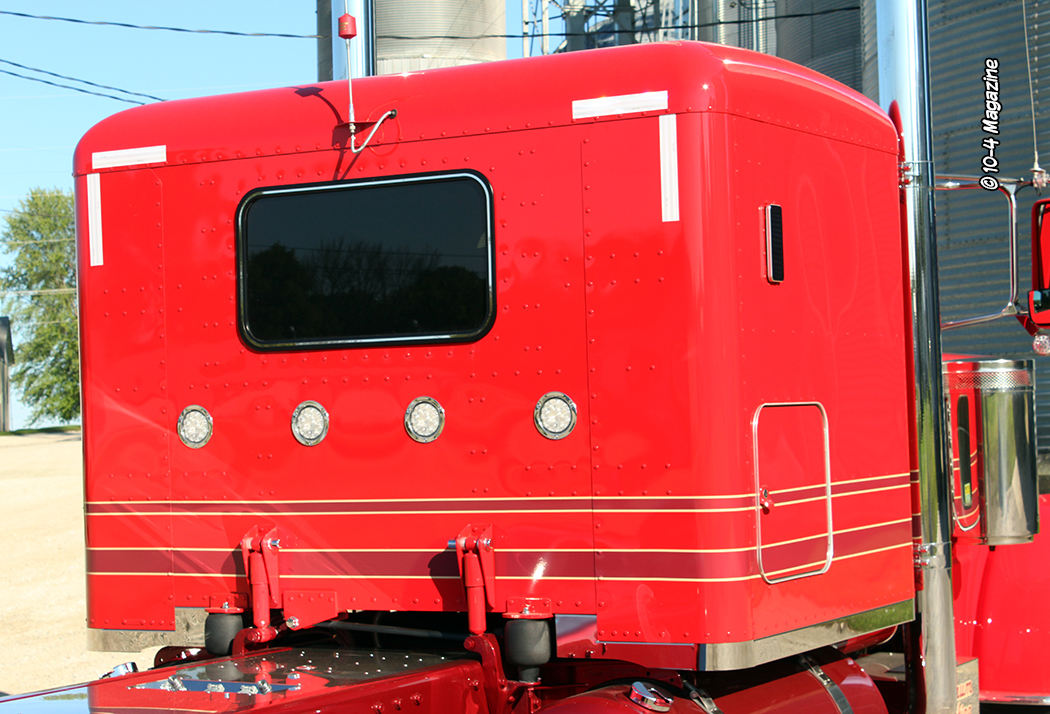 This new Pete is a Platinum Series model with a complete instrumentation package.  The powerful Cummins engine is backed with an 18-speed transmission and 3.25 rear-ends.  Because Mason is a big fan of Viper Red, he ordered his 2021 the same color as the 2018.  He had the factory paint the 290” wheelbase frame Radiant Fire Effect.  The cab and chassis sit on 22.5 low profile Michelin tires mounted on Alcoa aluminum rims.  After picking the rig up from the dealership, Mason took the truck to Harrison Truck Center where they painted the side air tanks, fuel tanks, and frame rails in a glossy pearl metallic Radiant Fire Effect.  He also had stripes added to the cab and sleeper that match the frame, and then outlined them in thin gold stripes.