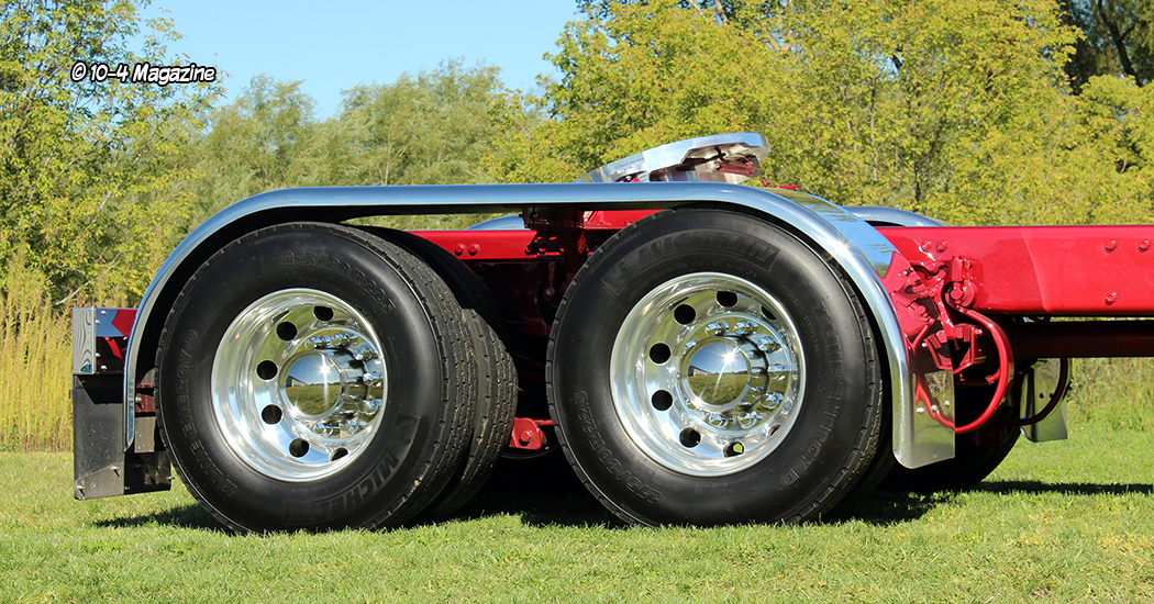 To protect the freshly painted frame, Hogebuilt full tandem fenders were installed by Silver Customs.  To give the fenders a clean and sleek look, hidden brackets from I-29 Customs were used.  Smooth and polished stainless covers were added to the boxes below the cab, and Mason replaced the factory exhaust with 7” Dynaflex pipes.