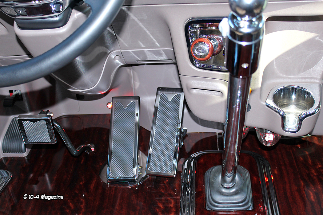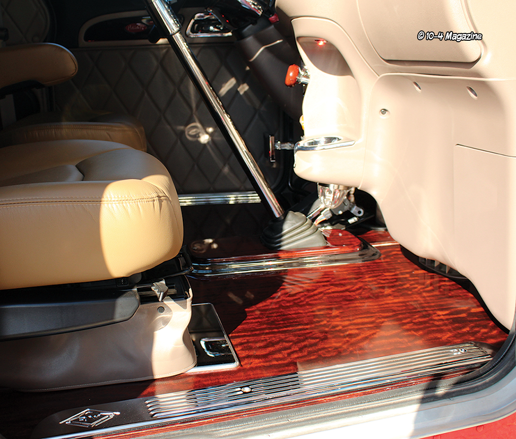 The interior customization was as extensive as the exterior.  Mason began by “ripping” out all the door panels, flooring, headliner, and interior panels leading to the sleeper, and then took out the factory seats.  He always liked the rosewood dash in his dad’s Freightliner, so he chose to go with that theme.  He ordered African Rosewood dash panels and matching teakwood flooring from Rockwood.  Silver Customs completed the installation of the woodwork.