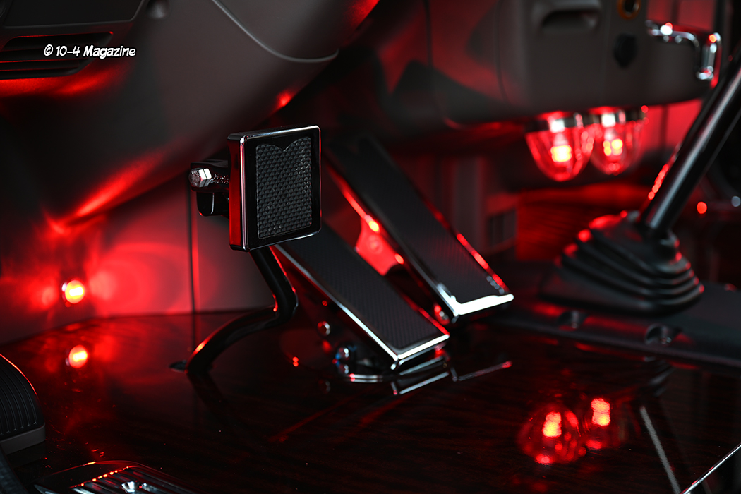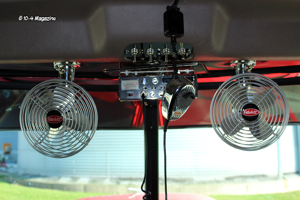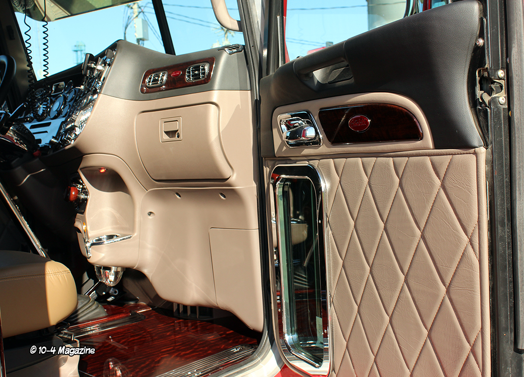 Spare Time Fab installed color matched, brown stitched door panels, headliner, and interior sleeper panels that match the Sahara Tan leather seats inside the truck.  Other finishing touches to the interior included the installation of a VIP steering wheel covered in leather, dual old school interior fans located near the CB, custom red watermelon dome lights, and a custom chrome sleeve for the 18-speed shifter.