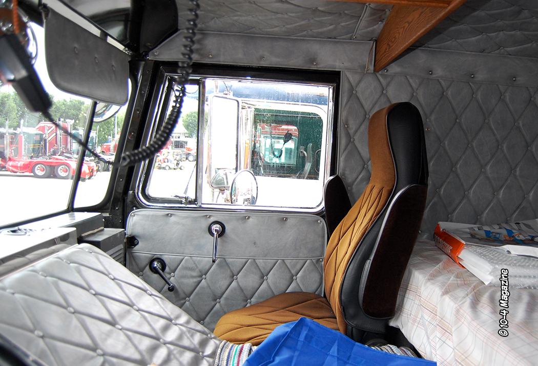 Inside the cab, the interior of the cabover is all custom. Sporting a custom St. Louis Diamond Tuck gray interior, as well as a custom 24” mattress in the sleeper (yes, the truck only has a 24” bunk), high back Eldorado seats adorn both the driver and passenger sides, with a custom center console mounted to the roof that houses the CB radio and stereo head unit. A polished stainless steel dash sports a complete set of gauges, and more gauges are included above the driver side front window, a feature unique from the factory on these cool Diamond T 931C cabover trucks.
