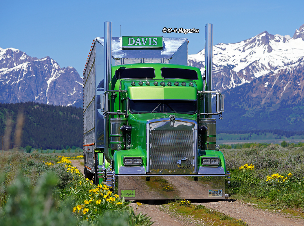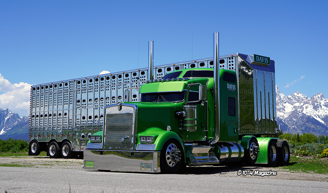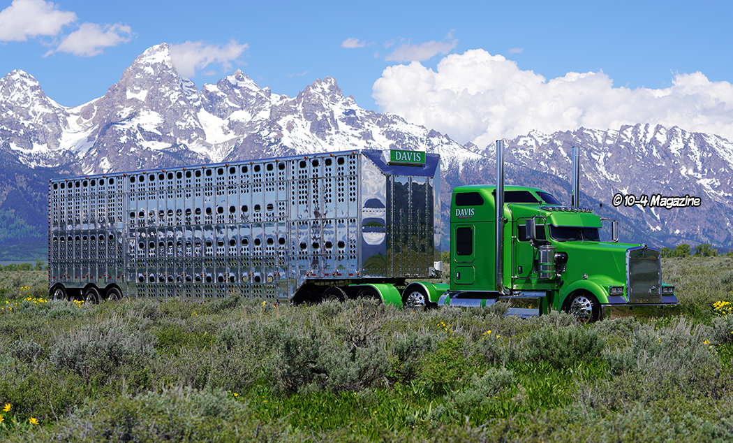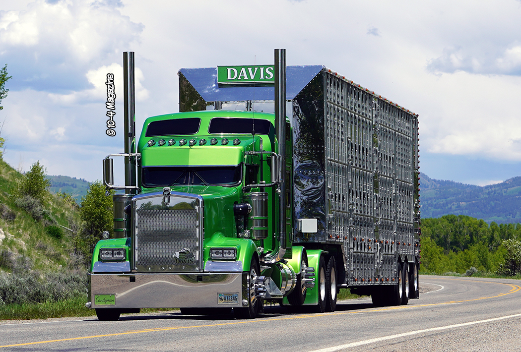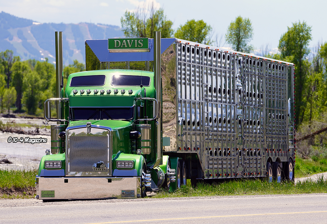 One of the states that come to mind when I think “out west” is Wyoming.  It is home to national parks, wide-open spaces, snow-capped mountains, wildlife, beautiful landscapes, and livestock.  Cody Davis (36) of Davis Trucking LLC out of Cokeville, WY, owner of the pictured green Kenworth W900L, has another name for Wyoming – home.