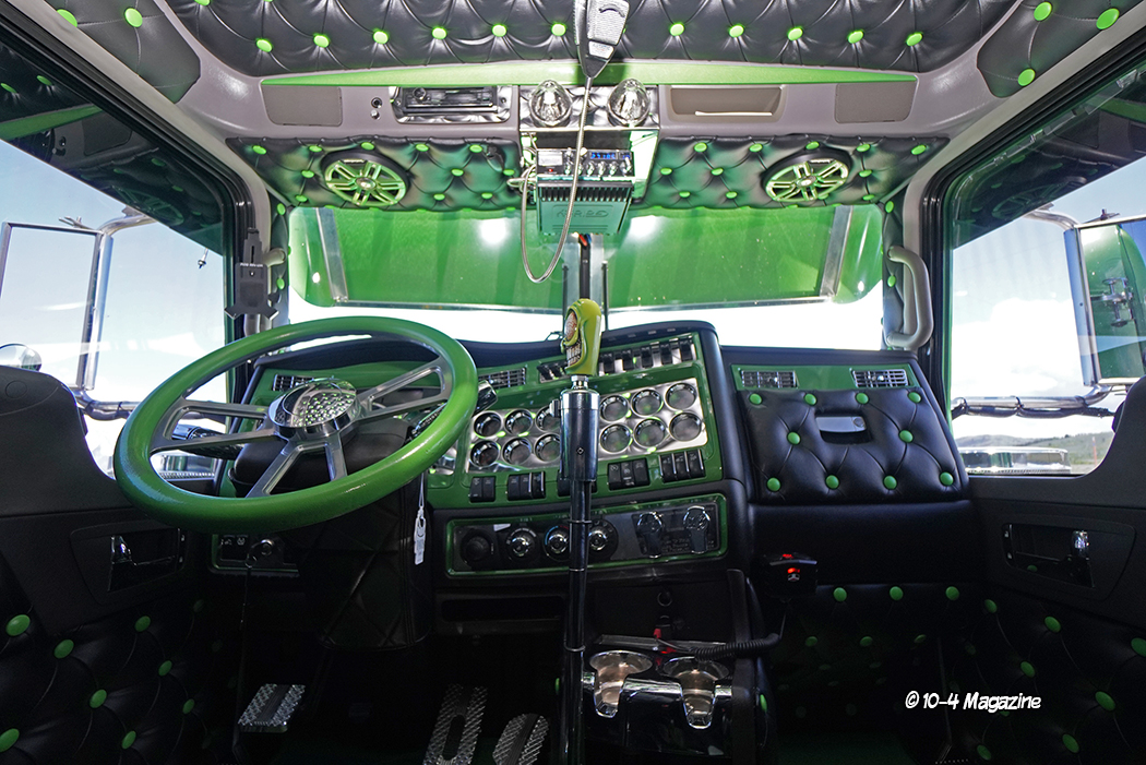 Looking inside, you’ll find what is called the “Seattle Package” in black leather with green buttons by Two Bees in Seattle, WA.  Extra paint work was completed by PDI, a Rockwood Products floor was installed, along with a sound system by HS Customs out of Logan, UT.  Something else to note is the elk in the custom grill, made by SH Tube, as well as the one incorporated into the Kenworth hood emblem, on the front of the truck.  Cody and his family grew up hunting elk, but they also see them as majestic animals.  He and his family enjoy taking hikes, searching for elk, just to be able to watch them.