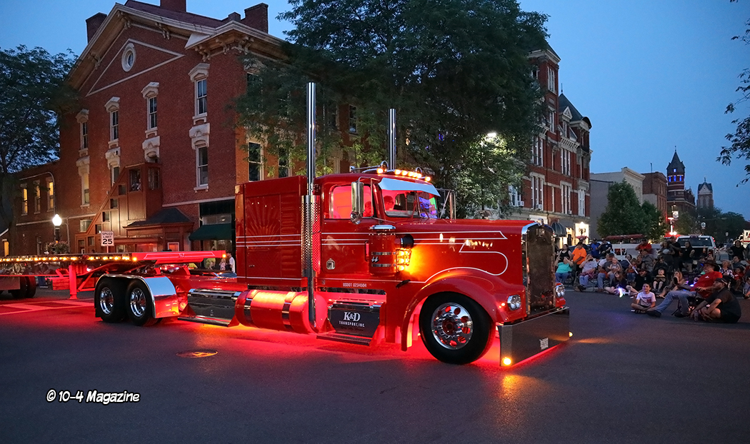 Heading to downtown Chillicothe where the parade was going to be held, I couldn’t believe the number of people that showed up – it was way more than the previous year, for sure!  All 50 of the invited trucks were in the parade.  They had a route set up like last year that took them on a path through downtown and eventually put them in front of the iconic Majestic Theatre.  This theatre was built in 1853 and marked the beginning of better entertainment in the city.  A speaker announced the driver’s name and where they were from, along with the year and model of their truck.  It provided a great opportunity to get a picture while they were stopped in front of the theatre, underneath an arch, with a lighted sign.  The last truck in the parade was a black 100th anniversary W900L with a Studio sleeper (truck #001), pulling a flatbed trailer with Nashville recording artists The Mantz Brothers Band playing live.