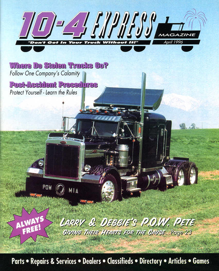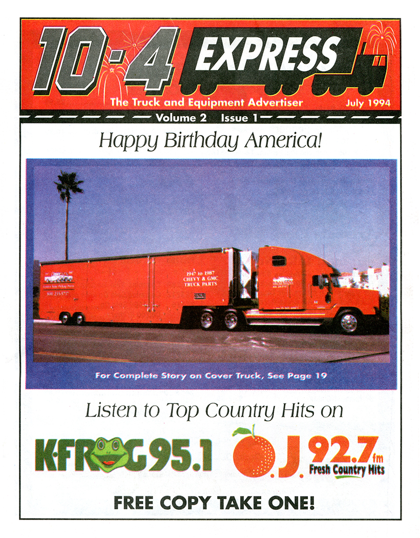During most of our first year, being primarily a classified truck advertiser, we printed two issues a month. Our first “cover story” landed on the October 1, 1993 issue (the third edition) and was literally just that – a small black and white picture of a 1953 GMC 906 owned by Dick Huizenga, with a few sentences printed next to it right there on the cover. The April 15, 1994 issue featured our first full-page cover story printed inside the magazine (still just black and white). In the beginning, our tagline on the cover was “A Trucker’s Best Friend,” but in July 1994, after changing the name to 10-4 Express Magazine for legal reasons, we adopted the tagline “The Truck and Equipment Advertiser” and switched to a once-a-month format.