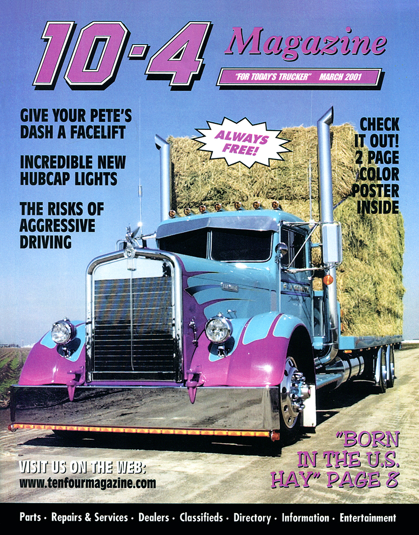 By mid-1994, spot colors had been introduced to ads inside the magazine, and the cover picture was now printed in color, as well. In May 1995 we coined the phrase, “Don’t Get In Your Truck Without It!” and used that on the cover for many years. In February 1996 we introduced a full-color cover on glossy paper, and then in November 1998 we began inserting a few full-color glossy pages of ads into the center of the book. In July 2000 we switched our name back to 10-4 Magazine (and copyrighted it) and introduced our tagline “For Today’s Trucker!” which we still use today. But our biggest addition – the two-page full-color centerfold – still had yet to make its official debut.