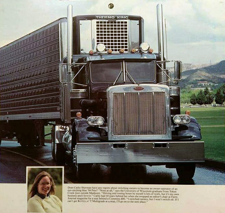 What sets Cathy apart from so many other worthy contenders is she did this all backwards. Before her driving career she was a journalist for one of the larger farm publications in the Midwest. This led her to do much promotional work on behalf of the industry, and her objectives were for safe highways and to improve the image of trucking. Lord knows we needed it back in 1993. I asked Cathy about her award as the Independent Contractor of the Year, which she received in 1994. Along with the award was a brand new tractor! Yes, she parked her 359 and climbed aboard her new International Eagle, which was paired with a matching reefer trailer. She and her matching unit were common sights at most of the truck stops between Wisconsin and California.