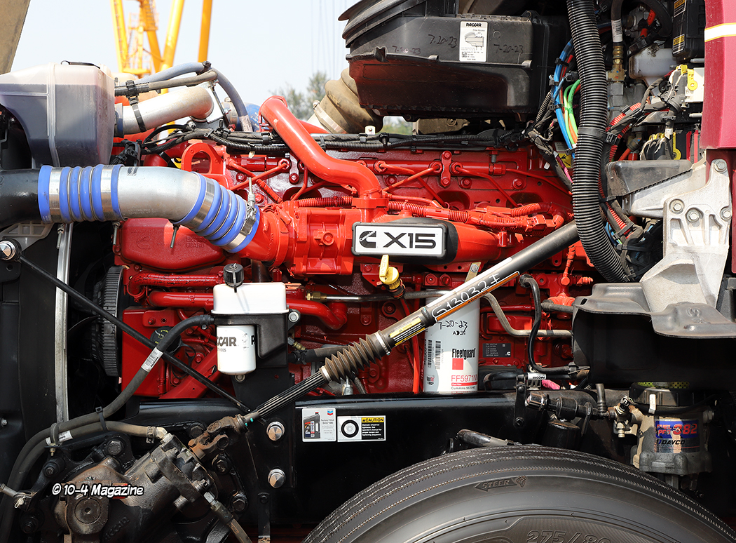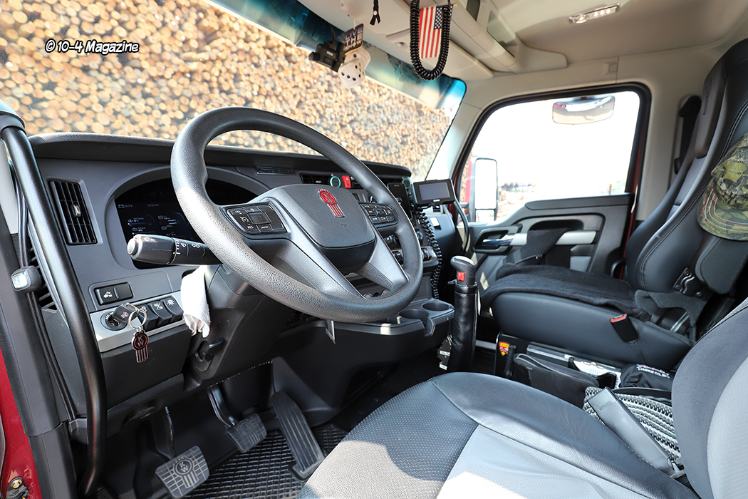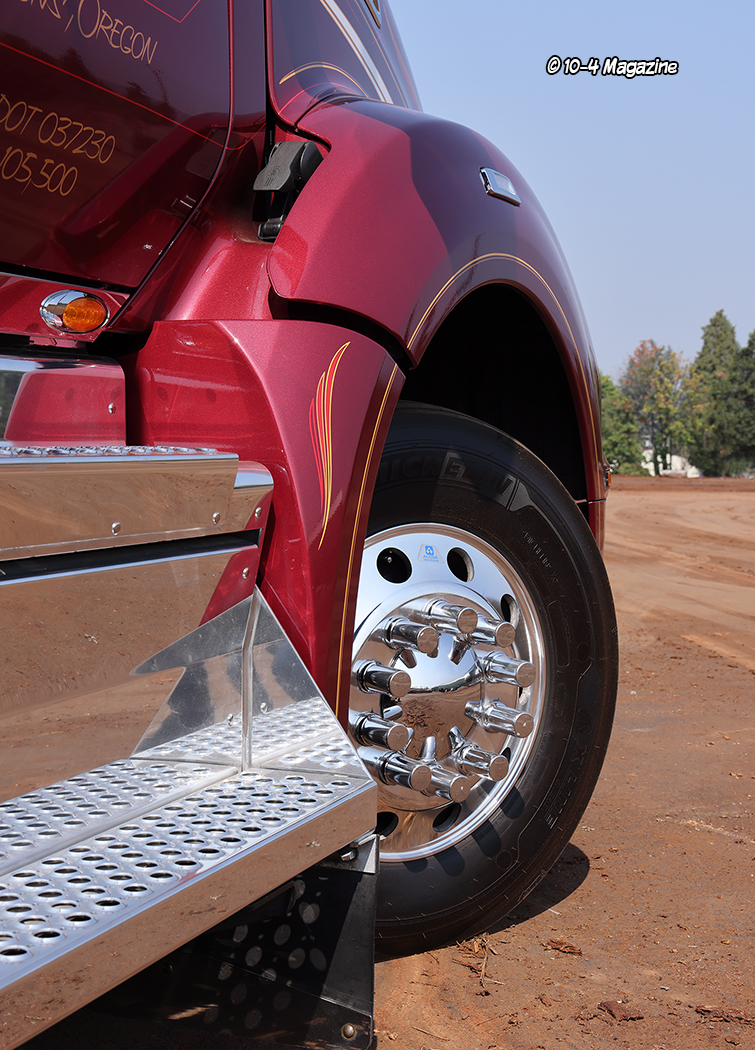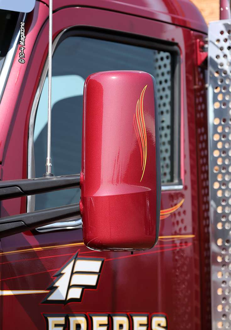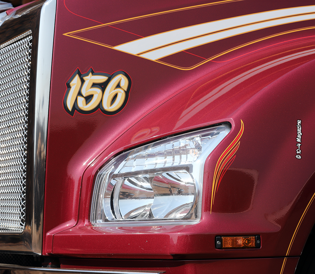 In January of this year (2023) Eric got his next and current brand-new truck – the 2023 Kenworth T880 Limited Edition (Truck #156) seen on our cover and centerfold this month and on these pages. All the trucks are painted the same colors – Medium Red Metallic with white, tan, gold, orange, and red accents – and Eric’s is no exception. Powered by a 500-hp Cummins X15 hooked to a 13-speed and 3.42 rears, the daycab tractor features stripes and pinstriping that is similar on all their trucks. Interesting fact: the door logos and truck numbers are vinyl, but they are hand-painted vinyl. I did not even know that was a thing! Apparently, it makes the logos and truck numbers look hand painted (which they are), but they are easy to remove when it comes time to sell the truck.