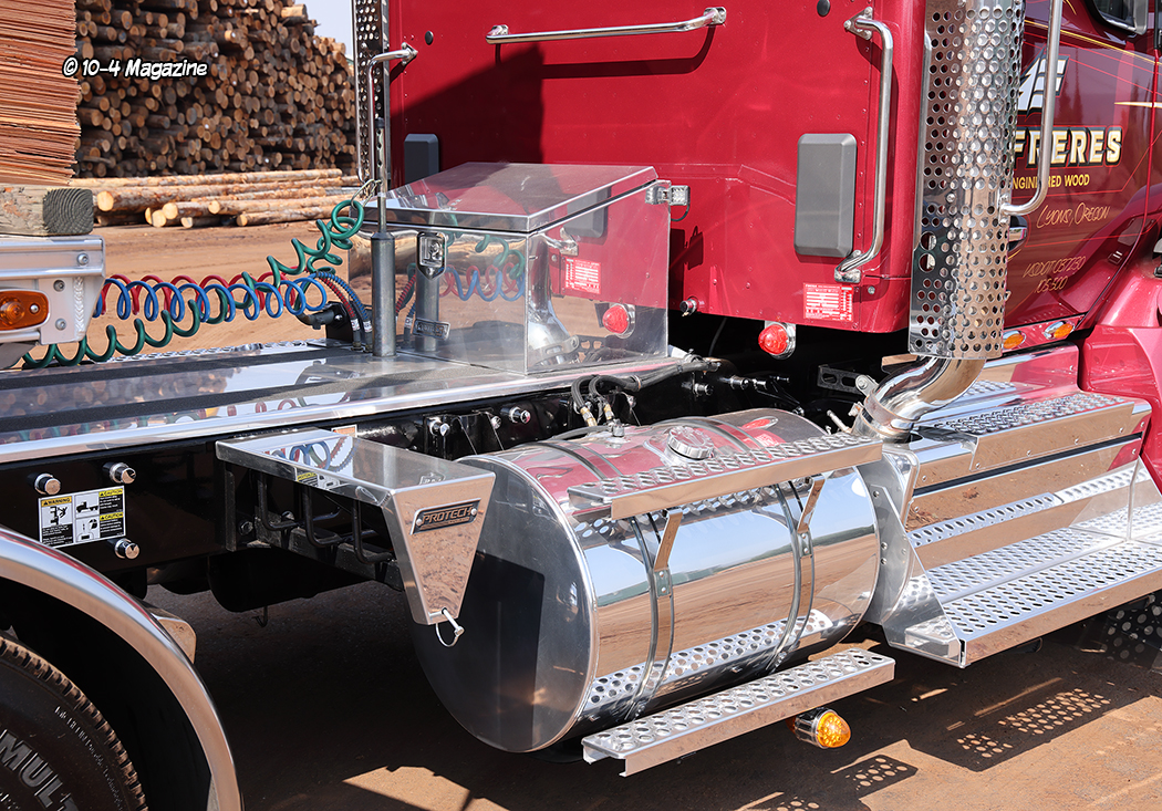 Some of the extras Eric’s truck has includes smooth steps, six-inch Dynaflex pipes with flattop tips, a chrome swan, a semi-custom front bumper with square ends and no extra holes, and plenty of added lights. The truck also has stainless drop panels with extra lights, a RoadWorks visor, a ProTech polished deck plate, storage box and chain hanger, Hogebuilt stainless half-fenders, and a custom all-silver KW emblem on the front. Most of the accessories for the trucks in the fleet are purchased through our friends at Schott Parts & Accessories in Salem, OR. The shop at Freres does most of the work on their trucks, but Eric has been known to do a few things on his own, as well.