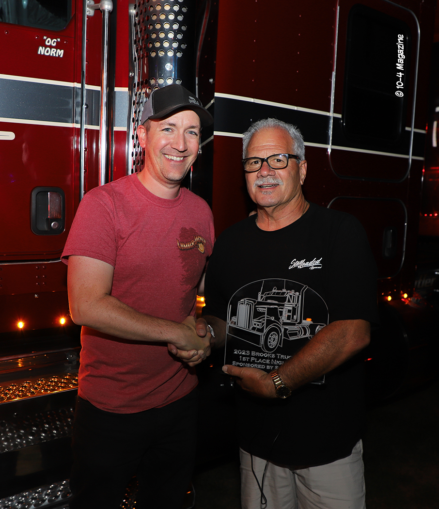 Heading to the show grounds to get set up on late Friday morning, we were surprised at how many trucks were already there.  We were also greeted by Darryl McFarlane – an interesting 84-year-old fan and reader of 10-4 from Oregon that came to help us in the booth and hang out.  Darryl came to the show both Friday and Saturday and proved to be very helpful.  We would like to thank him for coming.  After getting everything set up, we strolled around the grounds to check out the trucks, take some pictures, and talk to old friends we hadn’t seen in a while.  As the day came to a close, we headed to dinner with the folks from Schott Parts and Accessories, Sal from Dynaflex, Ray from Valley Chrome, and a few others.  It was a nice time with good folks and great food.