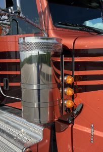 After receiving a partial payment, Pat the painter laid on the 90s paint scheme in a deep burgundy color, and while Pat was painting, Charles started gathering my grocery list of parts and pieces. After the paint, Mike installed NOS original factory 379 dual headlights, a RoadWorks grill and bars, a Texas bumper, steer axle dumps, a Bowfish stainless visor, stainless Hogebuilt fenders, and 5” top stacks. He also installed my three-light front and rear breather panels, dad chopped the screens, the right side box was lowered and a stainless cover was added, the DEF tank was hidden in the left side fuel tank, and quick coupler airlines were installed, along with a new driver’s side seat base.