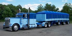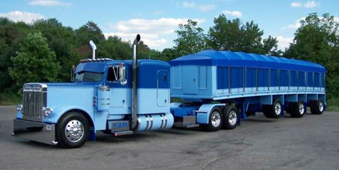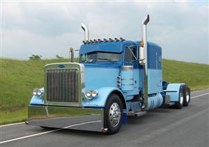In 1997, Clint changed dealerships and began selling used trucks at Kansas City Peterbilt (one of the last family-owned Peterbilt dealerships). Phil Cooper, who had been selling cool trucks since 1965, took him under his wing. When Phil passed away in 2001, Clint moved into new truck sales and took over Phil’s customers (he had requested that). “I owe a lot to Phil and miss him to this very day,” said Clint. Specializing in ordering trucks for people who are picky, Clint (35) has made a name for himself as the guy who never let’s the word “can’t” roll off his lips. What the factory doesn’t want to do, he finds a way to get it done. Most of the trucks he builds are Peterbilts with unique colors, clean lines, and classic styling. Clint considers himself more of an “interpreter” than a builder. Most of Clint’s customers already know what they want - it’s his job to make sure that they get it. For this first column, Clint chose to feature a unique baby blue and dark blue Peterbilt that he recently delivered to Frank “Pug” Pugliese of F & R in Portage, Indiana. Pug had a sweet A-Model KW named “Aftermath” with a V-8 that he ran for 15 years, until a snowy November day, when a truck jackknifed in front of him and forced him to put her into a ditch on her side. This broke his heart. The truck was totaled, so Pug decided to let Clint order him a new custom Peterbilt.