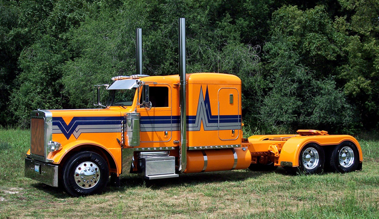 GETS AN OLD LOOK Clint Moore’s latest creation is what he calls “an obnoxious-colored” 2007 Peterbilt 379 built for Jim & Susan Lane of Brookfield, Missouri. The Brookfields have been one of Clint’s most longtime and loyal customers, and they are known to have owned some interesting looking rigs - their last one was pink with purple flames. In the past, Jim was the one who chose the colors for the trucks, but this time Susan and one of their children, Brice (20), decided it was their turn to pick. Susan and Brice went down to Clint’s office and started rummaging through his old literature and paint books and found a cool “heartbeat” paint scheme from 1979. As it turns out, 1979 was the year that both Jim and Susan graduated from high school and the year that they got married, so it seemed like a perfect choice. The truck was ordered with a 625 Cat, a 63-inch flat top sleeper and Bright Orange paint. The stripes were added in the shop after delivery. They also installed 7-inch flat cut pipes, a drop visor, nine bullet lights, cab and sleeper panels and WTI fiberglass rear fenders. Then, they chopped the tops of the air cleaners, reskinned the passenger-side door without a peep hole, powdercoated the deck plate and tanks, and added a 359 polished center strip down the top of the hood. Jim and Susan had the pleasure of going to the Peterbilt plant in Denton, Texas to watch their truck get built. They were amazed at the care and attention that every employee took with their soon-to-be new ride. Growing up on a farm, Jim tried being a farmer but just couldn’t get trucking out of his blood. Jim and Susan, who also have a 23-year-old daughter named Brandi, use this rig to pull a reefer between Missouri and the Northeast. This latest truck is a far cry from Jim’s first - a 1978 Freightliner cabover with no power steering and a spring suspension. Jim is happy that those days are over! Copyright ©