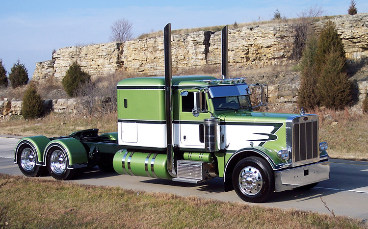 OUT IN THE END Clint Moore’s latest creation was originally ordered for an owner operator that works for Shane Gigstad of SMG Transport in Horton, Kansas, but due to an unexpected divorce, the owner operator could not take it. Shane agreed to buy it, but he really didn’t like the green and white paint scheme it came with. Clint told Shane that he wanted to add a dark green stripe to the scheme. Shane agreed to let him do it saying, “If you have a vision, you’d better get it on.” So Clint and his crew added the dark green stripe and signature “hook” paint job to the 2007 Pete 379 featuring a 63” flattop, a 625 HP Cat, a 280” wheelbase and low air-leaf suspension. After the paint was complete, the guys added a custom drop visor, five bullet lights with clear lenses and 7” miter-cut stacks. Then, they painted the fuel tanks and air tanks green, put four bands on the air tanks to match the fuel tanks and installed a motor meter hood ornament. The rear of the truck was fitted with WTI fenders which were painted to match and Rhino lined underneath for protection from the elements. Up front, the finishing touch was a set of double 359 headlights on JJ brackets. When Shane saw the truck, he was surprised at how much he liked it. He told Clint that he was proud to add it to his fleet. Shane’s trucks pull RGNs, step-decks, flatbeds and lowboys throughout all of the 48 states. If you happen to see this truck or one of his others out on the road, give the driver a shout, because he’s got a cool boss. Copyright ©
