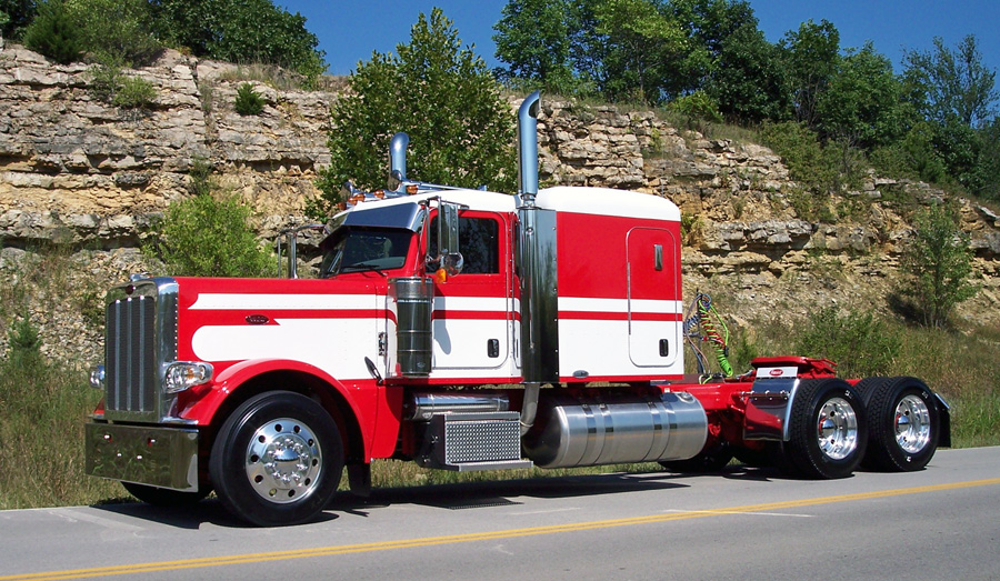 When it came time for Steve to get another truck, he came down to see Clint. Walking the lot together, Steve said, “Any of these will do, but it sure is more fun to order one.” So that is what they did. Peterbilt invited Clint and Steve to come down to the factory and watch the truck be built, which really stood out as it went down the line. This new truck is the Pure White and Viper Red 2008 Pete 389 also pictured here. Featuring a new-style 63-inch flat top with a fold-up bed inside, a C-15 Acert engine, a low air-leaf suspension with a car hauler front axle, polished aluminum wheels, dual stainless steel breathers, a Prestige interior (with no navigational system) and lots of chrome gauges and rocker switches, this truck is simple yet very elegant. The truck’s Seminole paint scheme was done at the factory and features a white roof for that “old school” look. Once it arrived, just like the last one, all Clint did was add a drop visor and the lettering. Once Steve got it home, he added some gold tape pinstripes because the factory refused to paint a third color. So there you go - two fine examples