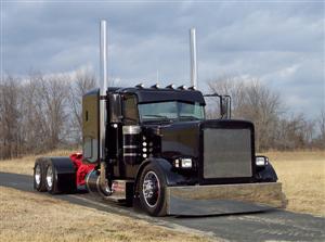 GOT TOO LOW Clint Moore’s latest creation belongs to Jeff Houts of Golden Harvest Farms in Madras, Oregon. Jeff, who is a third generation farmer, bought his first truck ten years ago for hauling hay and other supplies needed around the farm. Since then, he has owned a few Petes and five KWs. Currently, he has a 1997 long hood Pete and, now, this new 2007 Pete 379 with a 48” flattop. All of Jeff’s trucks have always been low and cool, but none as low as this latest one - it was actually so low, Clint had to put larger tires on it to make it taller. Everything on this truck was “blacked out” including the headlights, mirror brackets, air cleaners, cab lights, visor, grille surround, fuel tanks, wheels, the backside of the bumper and the sides of the battery boxes. The black powdercoat paint was applied as both a fashion statement and as an attempt to protect the truck from the elements as much as possible (running in Oregon and Washington in the winter can be rough on a truck). Other modifications included reskinning the right side door, smooth deck plate and trunk, clear lenses on the LEDs, 7” pipes, body drop panels and a flip-up front bumper. Jeff’s wife Pam thinks the truck is ridiculous, but his two sons Grayson and Joey love it. Jeff and his dad Bob came out a few days early and ended up running around fetching parts for Clint and his crew all week. Jeff grew up around hot rod cars and thinks his trucks are just oversized hot rods. Clint said the look on Jeff’s face was “priceless” when it was all done. Copyright ©