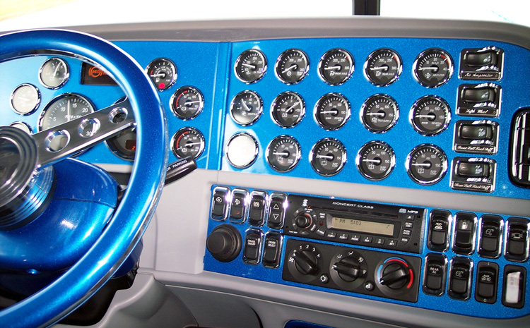 The first thing Clint did to Shane’s new truck was reskin the doors and then he painted the fuel tanks. Then he installed five bullet lights on the roof of the cab, six loads lights on the back of the sleeper, double 359 round headlights on Double JJ brackets, a painted drop visor and a painted flush deck plate. Clint and his crew then added five-inch body drop panels (painted to match), a rear light bar, many interior trim pieces, a custom three-spoke billet steering wheel, and a set of painted Fisher half fenders with hidden brackets. Clint and his guys then painted the dash and door panels, the windshield trim and the door handle covers, and then added the final touch - the “Van Hulzen-style” exterior paint job. Originally, the painted stripes were supposed to be Dark Blue with a Silver breaker line, but after Clint mocked it up in Photoshop on his computer, they decided to go with Silver Blue Pearl paint with a Pure White breaker - which really made the colors pop!