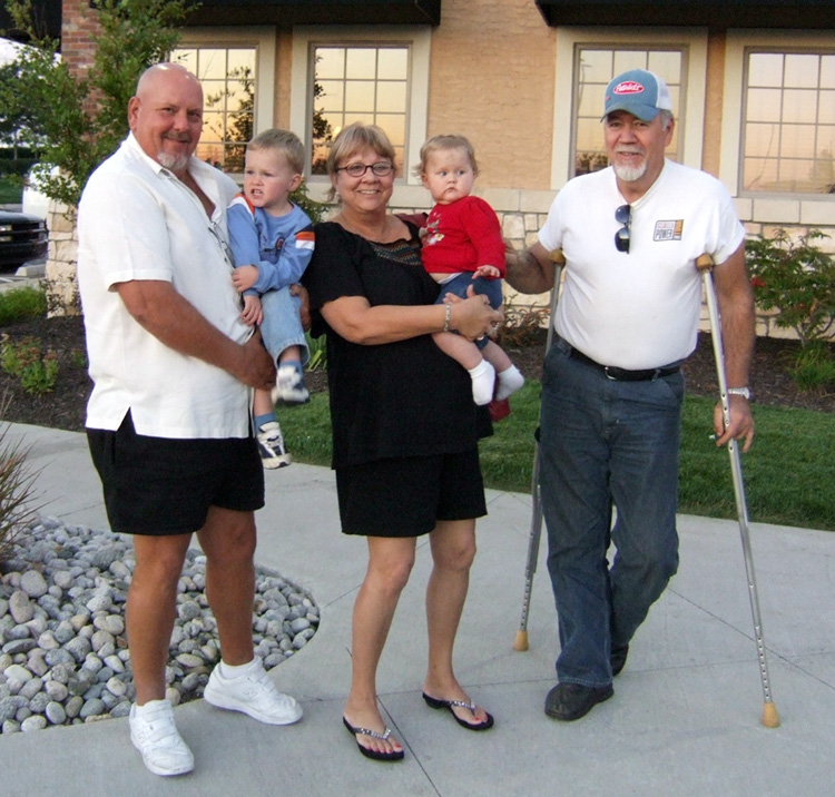 Today, Big John’s Trucking operates four trucks, four step-decks and two RGN lowboys, all of which can be linked to Clint Moore in one way or another. Big John has been a great customer for Clint over the years, but more importantly, he has become an even better friend. The picture above shows Big John and his wife Miss Linda holding Clint’s two small children, and that’s Clint’s dad Dave on the crutches.