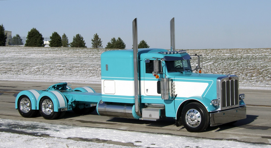 When it was time to order a new truck, Brett called Clint. His girls told him, “Enough with the white and purple! Why don’t you paint your truck turquoise like your old Chevy.” So he did. The 2010 Peterbilt 389 was ordered in turquoise with a matching frame, a 63-inch flat-top, a 600 hp ISX Cummins, an 18-speed trans, a factory “weed burner” exhaust (the 7-inch stacks are dummies), and a car-hauler front axle.