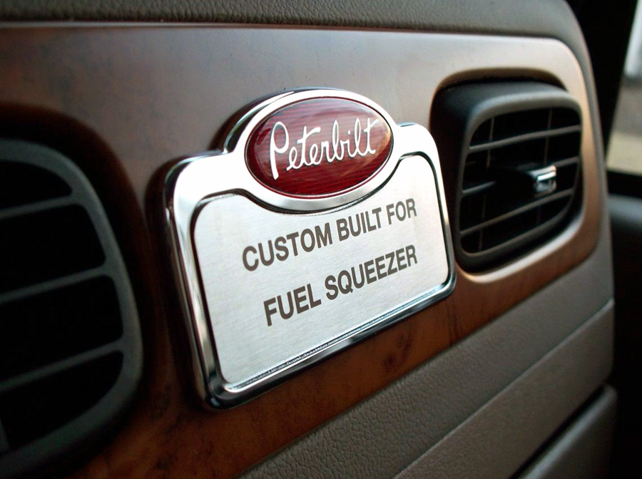 Sitting in on several meetings with the top dogs at Peterbilt and Cummins, Clint realized that much of the talk was about fuel economy - more importantly, how to improve it. Well, apparently Clint was listening. When he had the opportunity to order a stock truck for the dealership, he went a little out of the box and ordered a 2010 Pete 386 with a 70” HR and Peterbilt’s Aerodynamic package, which includes side skirts, aerodynamic mirrors, transition panels, and a roof fairing. He also ordered it with a Cummins ISX 450, a 236” wheelbase, 10-speed direct transmission, and 2:63 rear gears on super single tires. The dash plate says, “Custom Built for Fuel Squeezer,” but the truck wasn’t really built for anyone.