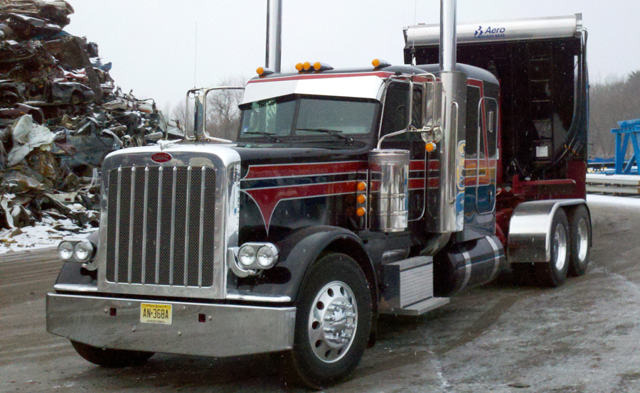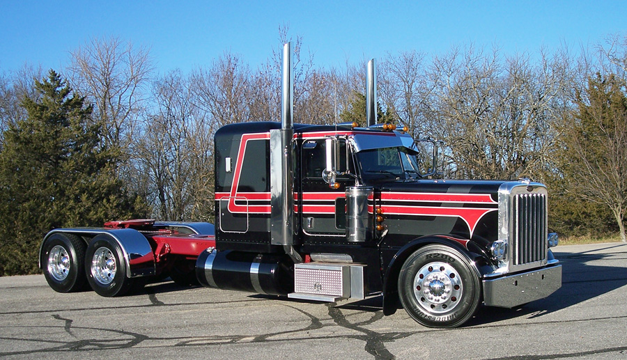 At first, Howard tried to buy a used truck, but he couldn’t get financing, so Clint ordered Howard the new 2011 Peterbilt 389 seen here. The truck, which is powered by a 500 Cat, has a 48” flattop sleeper, a 280” wheelbase, low-air suspension, an 18-speed transmission, a car hauler front axle with air-ride and a dump valve, and, unlike most of the trucks Clint builds, tall 24.5 rubber. The truck was ordered solid black with a burgundy frame. Clint worked hard to give this new 389 that “classic” truck look.