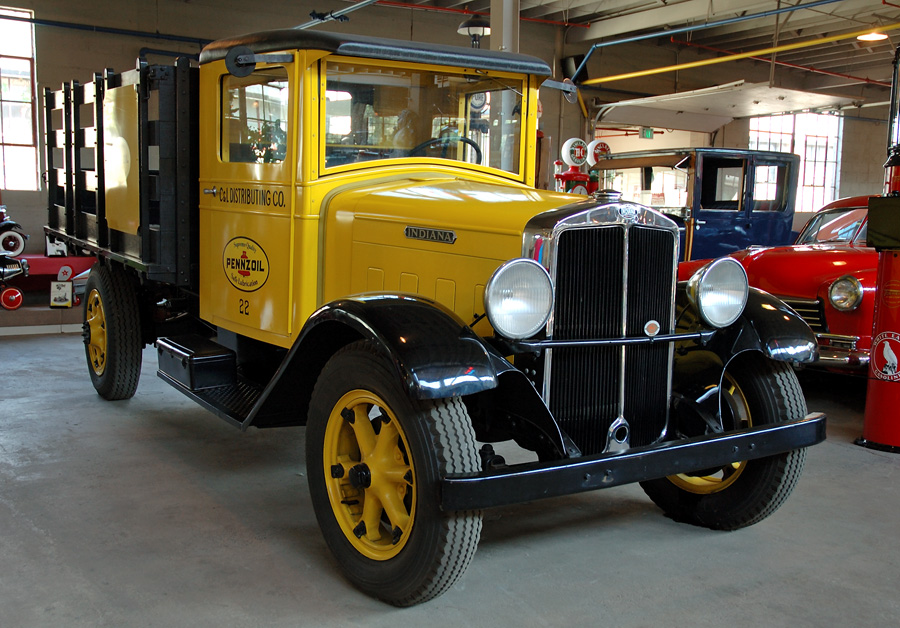 The Harwood-Barely Manufacturing Company began building Indiana trucks in 1906 in Marion, Indiana. Later, the company moved to Cleveland, Ohio and became known as the Indiana Motor Company. The first trucks were 1-1/2 ton with 3.3 liter 4-cylinder Rutenber engines, 4-speed gearboxes and side chain drive. By 1920, the truck line ranged from 1-1/2 to 5 tons with Rutenber or Waukesha engines (4-cylinder Hercules engines were available by 1924). From 1927 to 1932 the company was controlled by Brockway, who introduced Continental and Wisconsin engines. In 1932, White took control of the company and began using Hercules 6-cylinder engines with 4-speed and 6-speed gearboxes. Clessie Cummins pioneered the diesel engine in America and used an Indiana truck to demonstrate his new engine. Thanks to this relationship, Indiana was able to introduce the first production line of Cummins-powered diesel trucks in 1932 (which was a 5-ton truck with a 125 horsepower Cummins 6-cylinder diesel engine). The yellow and black truck pictured here is a 1933 Model 85A owned by the National Automotive & Truck Museum of the United States, located in Auburn, Indiana. This truck has a JXC 6-cylinder engine, a Brown-Lipe 4-speed transmission and a Timken rear axle. The last Indiana trucks were produced in 1939.
