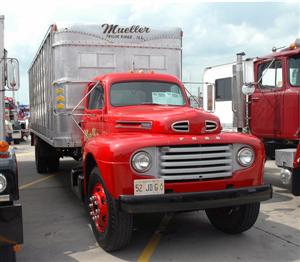 During World War II the Ford Motor Company pretty much stayed with the styling that had been found in their earlier models, but in 1948 the company introduced a line of new trucks called the F-Series, which is, amazingly, still in production today. This truck had an entirely new style from previous models. These new trucks were heavy duty two-third ton trucks with a big V-8 engine that had been upgraded from 100 horsepower to 135 horsepower, a five-speed gearbox and hydrovac brakes. The F-Series trucks could also be bought in a 6x4 configuration. In 1949 a model was introduced with a 6-cylinder forward control delivery chassis. The truck seen here is a 1949 Ford F8 with a V-8 engine. The truck was originally purchased as a fire truck and then later bought by Gerald Mueller. Mr. Mueller completely restored the truck with a frame-up restoration. Once the basic restoration was complete, he bought a Wilson livestock trailer and cut it down to twenty-four feet and put a new nose on it. The truck has a 391 cubic inch Ford big block engine, a five-speed transmission and a two-speed axle. As a fire truck it was not driven very much and even today the truck has less than 40,000 miles on the speedometer. The current owner is Gerald’s son Steve Mueller. Steve rebuilt the back of the trailer so he could put his 1952 International Harvester tractor in it and take it along to the shows. Today, besides hauling the antique tractor, this F8 is retired and only goes to shows and other fun events.