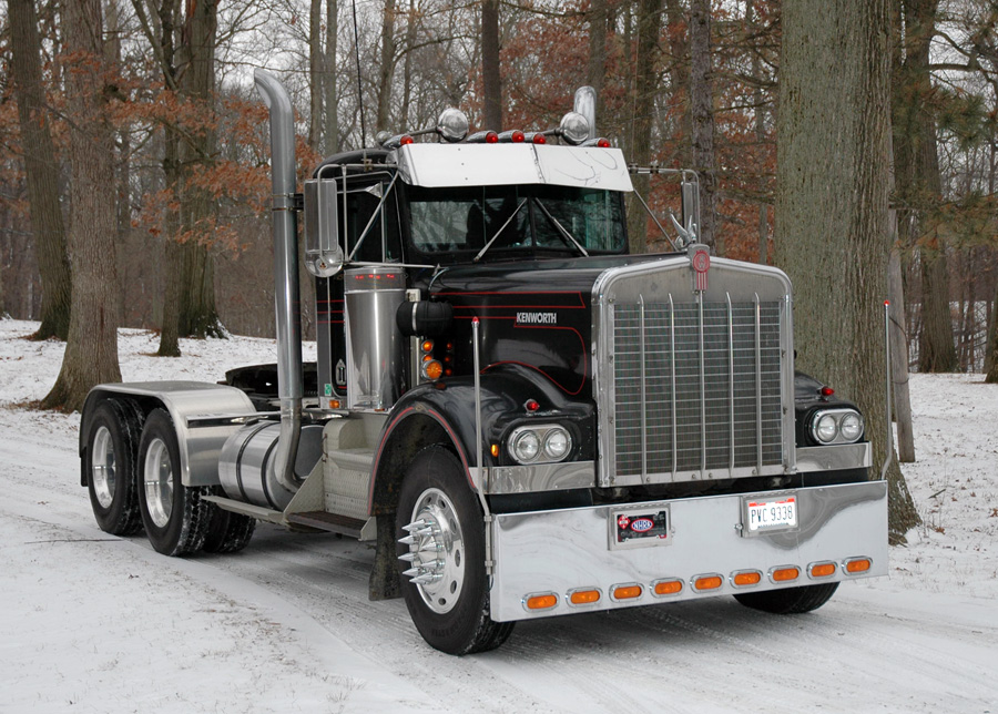 The Kenworth Motor Truck Corporation began in 1923. In 1932, Kenworth was the first American truck company to offer a diesel engine as a factory option, which was a four-cylinder 100 horsepower Cummins. The 1980 truck in this photo is one of Kenworth’s most well-known models – the W900A. The truck is owned by M & W Payne Trucking of Shandon, Ohio and driven by Matt Payne. Matt’s family has been in the same gravel hauling and excavating business for over 50 years. They bought the KW because one of their other trucks needed an engine overhaul and they had to have one to take its place right away. Matt had wanted a W900 ever since he was a kid and a friend of theirs had one for sale. Matt and his brother went to look at it and decided it was perfect (the truck had a wheelbase that was almost four feet longer than their other trucks). They ran it that way for two years until they bought a new lowboy. At that point, they decided to shorten the truck. Matt unbolted the rears and the auxiliary transmission and slid everything forward 40 inches. The space between the two transmissions is so tight that the driveshaft between them is only nine inches long. The KW is equipped with a 400 Big Cam III Cummins pumping out over 600 horsepower, which allows the truck to pass just about everything on the road. It also has a 15-speed Fuller main transmission and a 4-speed auxiliary, Kenworth 8-bag air-ride, genuine train horns, and a wet line. Matt says that the truck may not have all the creature comforts of a new one, but there’s nothing like driving a classic.