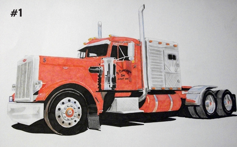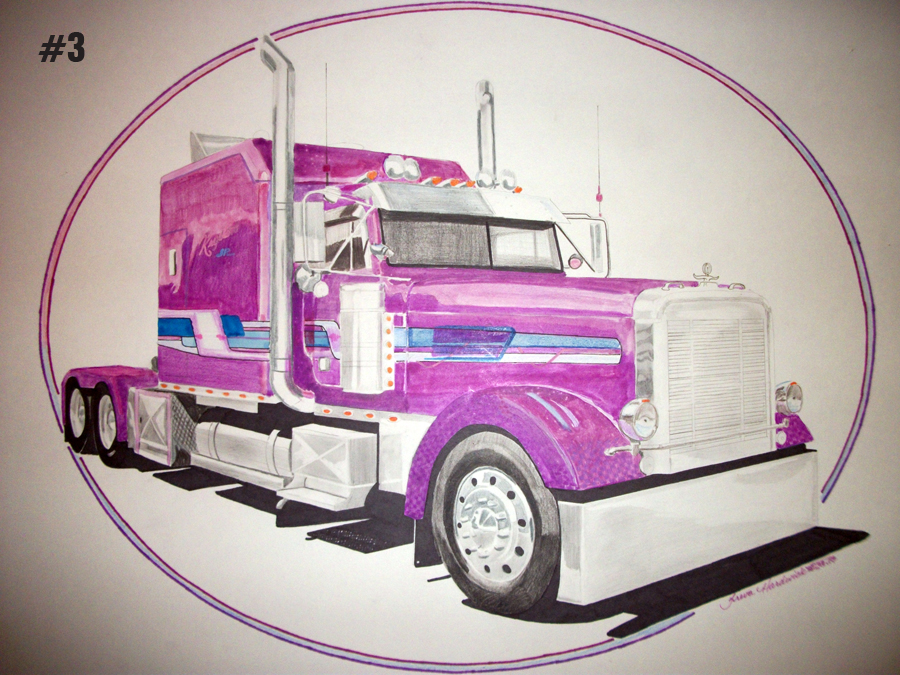 (Photo #3) This unique Freightliner Classic is owned and operated by Darian Stephens. For years, this truck was on the top of the show truck scene. Darian is a great friend and brother in Christ. His truck is immaculate inside and out, and even underneath. For this drawing I used markers, colored pencils and watercolor on 24 x 32 poster board. This truck is a challenge to draw because of all the details Darian put into the build of it. There are over 10,000 purple checker squares ghosted into the paint job. The front and rear fenders, and even the driveline, all have checkers! If you ever get the chance to meet Darian, he’s a great guy (I love to talk to him about old trucking stuff). He’s also not shy about his faith, and I appreciate that. You could stare at this truck for hours and probably miss many of the subtle details he has built into it.